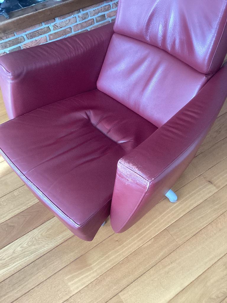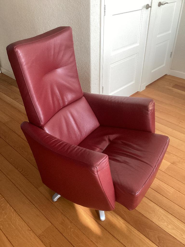 Rood leren draai stoel. Ik goede staat met alleen op de hoeken slijtage, zie foto. Degelijke robuuste stoel waar nog veel plezier aan beleefd kan worden. Afmetingen: hoogte: 112 cm breedte: 80 cm zitd