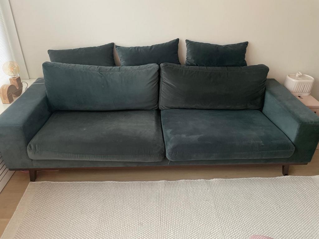 Mooie, comfortabele groene velvet bank. Ideaal voor een gezellige woonkamer. Gratis af te halen!