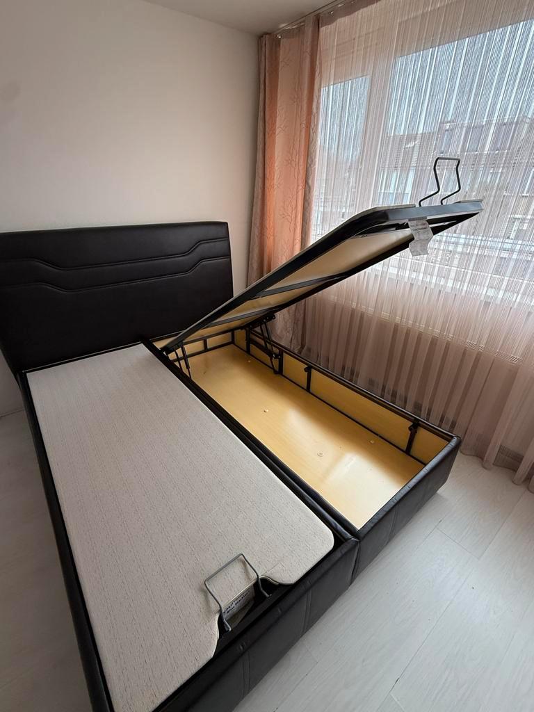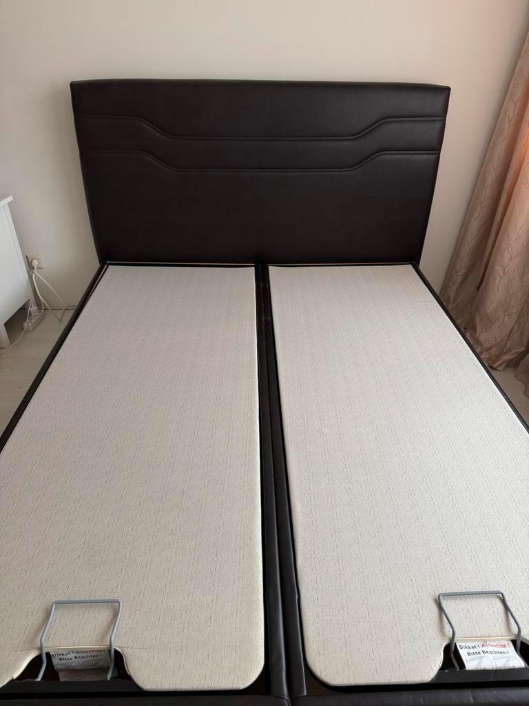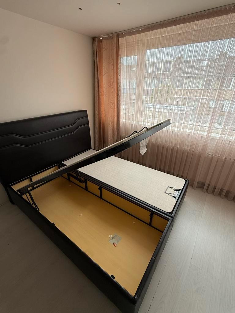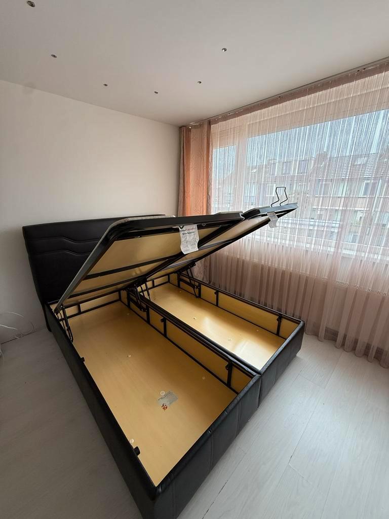 Mooi tweepersoonsbed met handige opbergruimte. Het bed is bekleed met zwart leer en is in goede staat. Ideaal voor extra opslag in de slaapkamer. Afmetingen: 160x200 cm. Zolang de advertentie online s