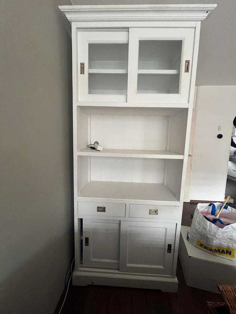 Mooie massief houten witte kast. De kast heeft glazen schuifdeuren aan de bovenkant en houten schuifdeuren aan de onderkant. Binnenin bevinden zich planken en lades voor voldoende opbergruimte. Ideaal