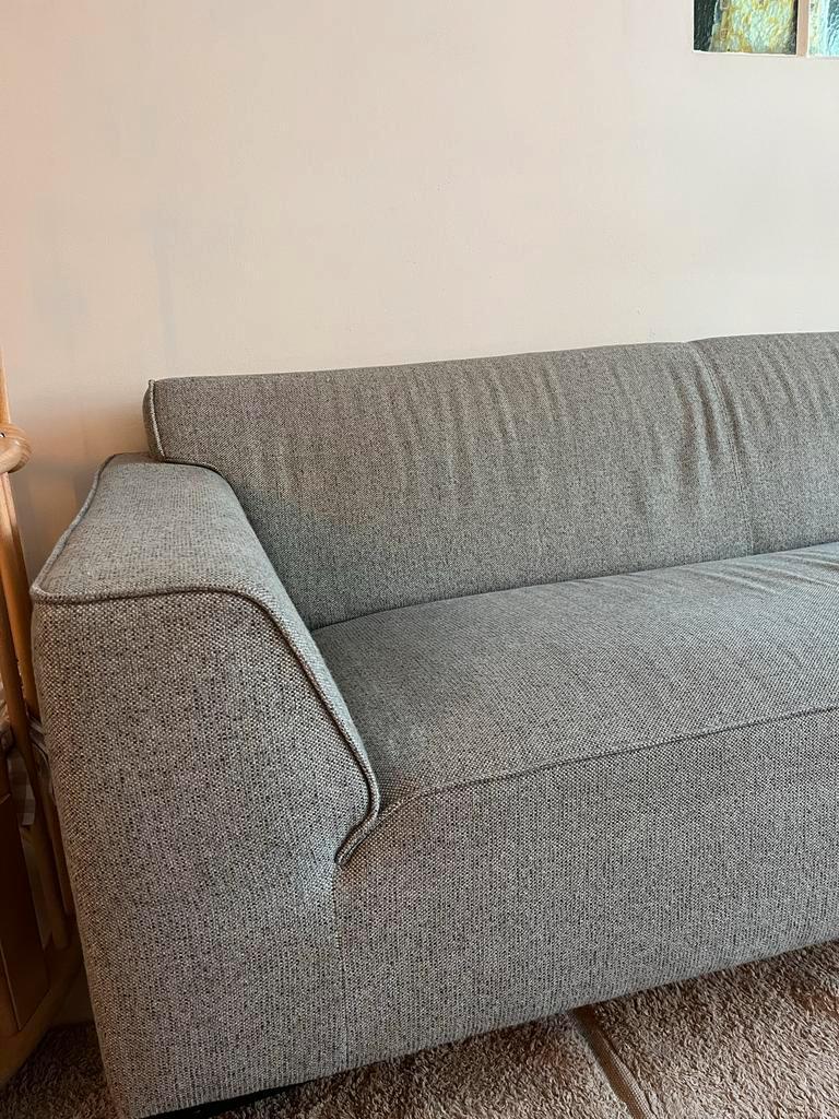 Graag zsm ophalen stijlvolle 3-zits bank van baenks, model bayside. De bank is bekleed met een grijs-groen gemêleerde stof fermo 142 sky. De bank is voorzien van pocketvering voor extra comfort en sta