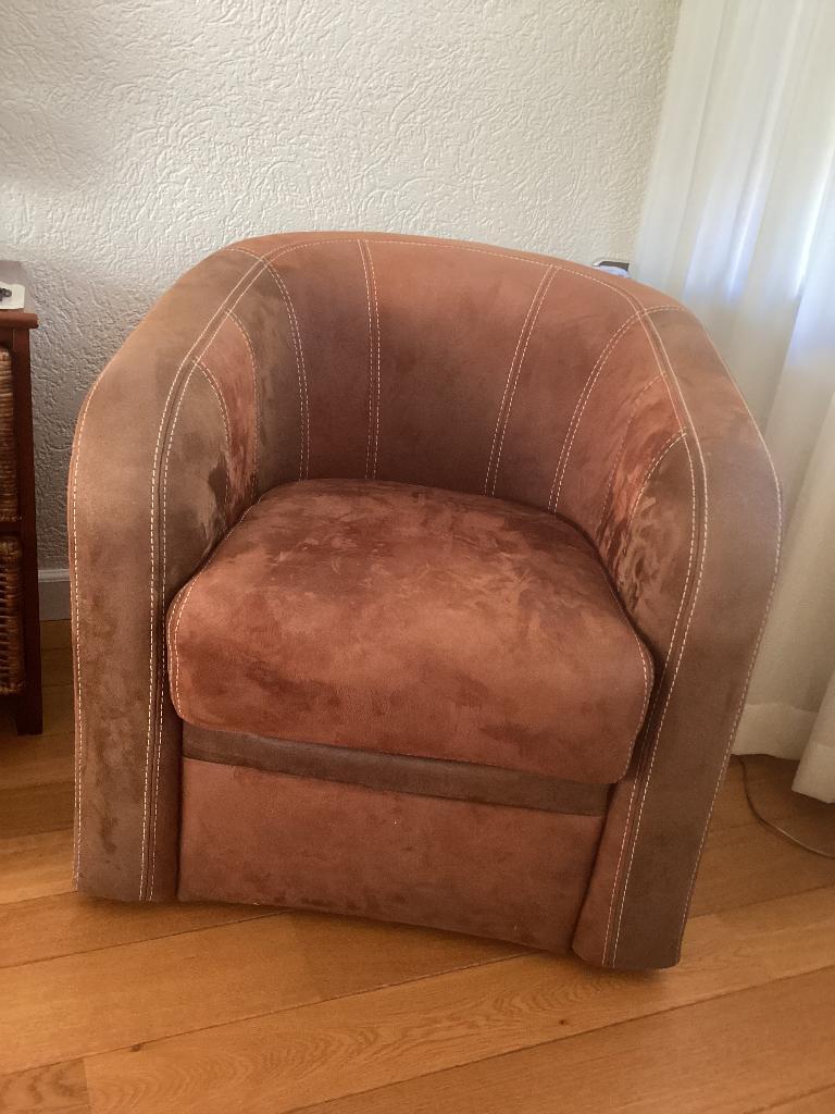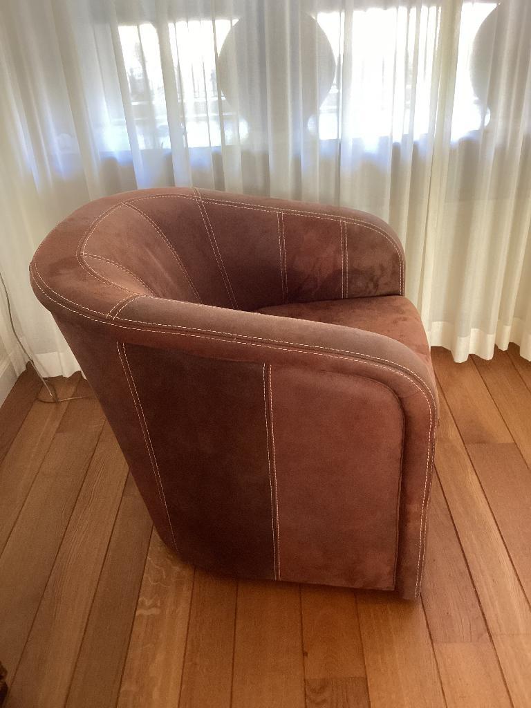 1 stoel gratis bij aanschaf van de 2 andere kuipstoelen. Dus 3 halen, 2 betalen. 3X degelijke suede kuipstoelen in goede staat. 1 Stoel afgebeeld, de overige twee zijn in dezelfde staat. Afmetingen: h
