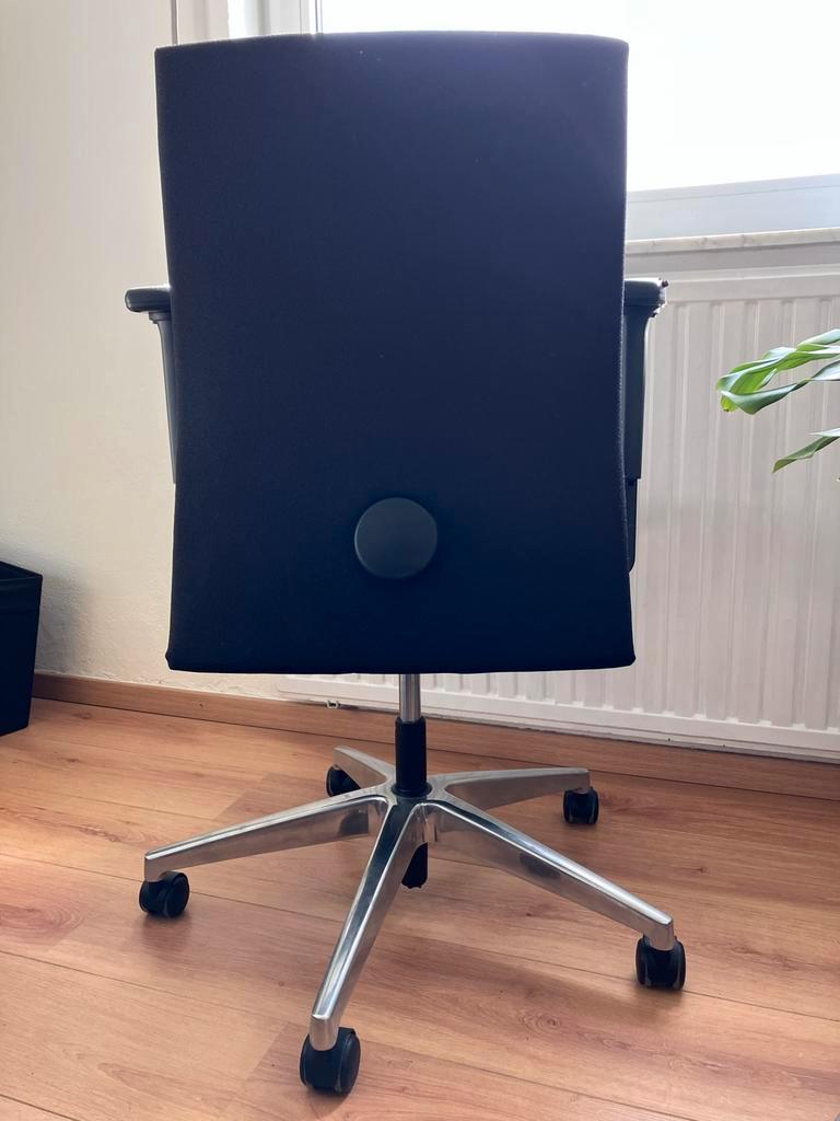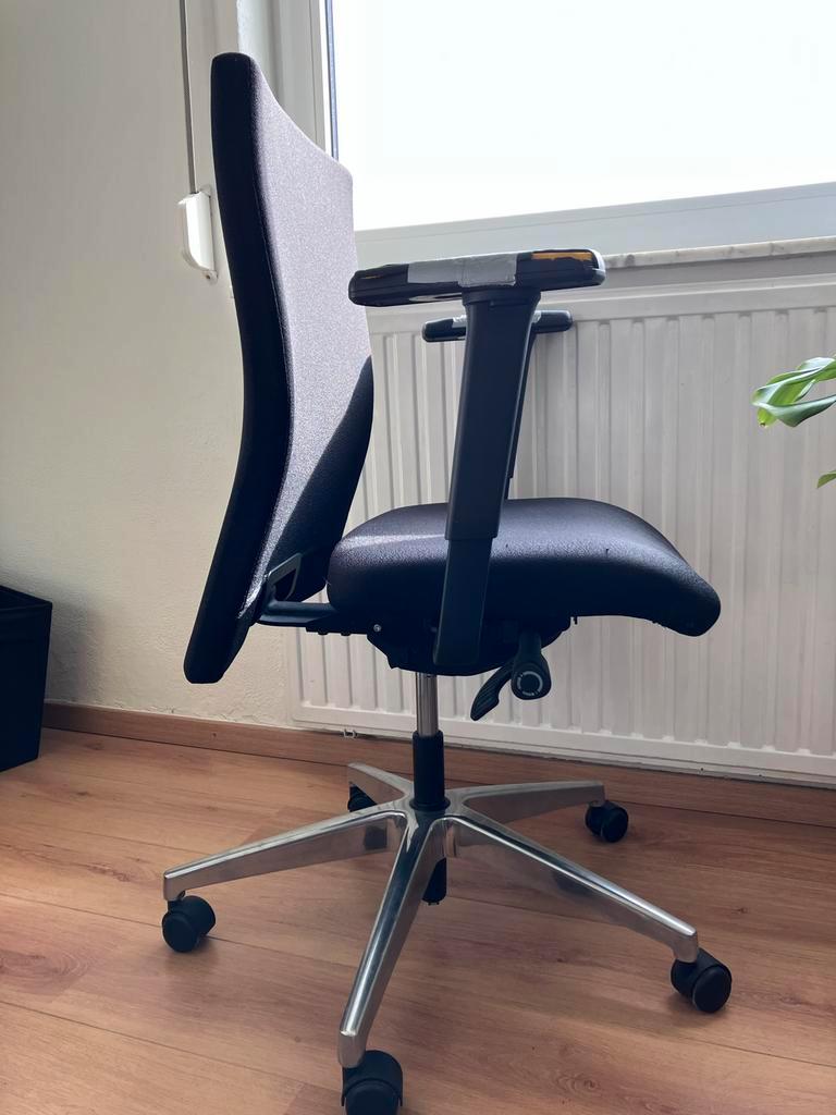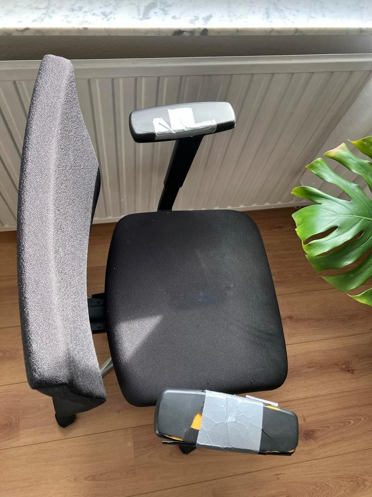 Zit nog heerlijk en is prima in orde, behalve de armleuningen (plastic brokkelt af, vandaar de ducttape). Rugstand, zithoogte en armleuningen verstelbaar.
