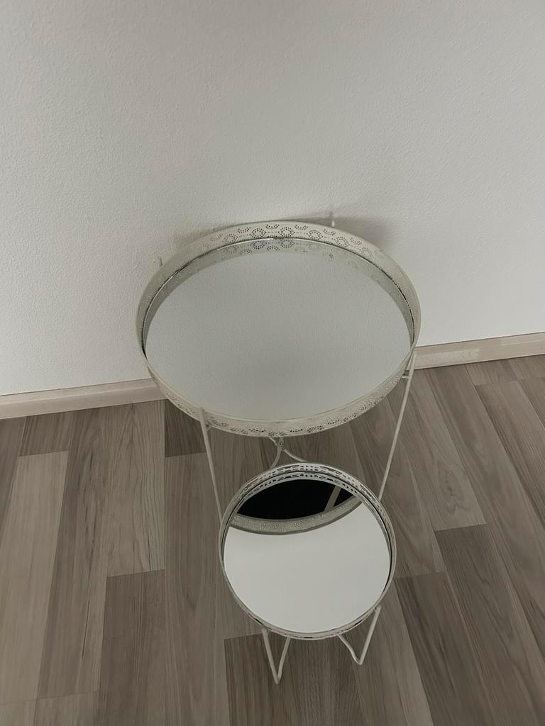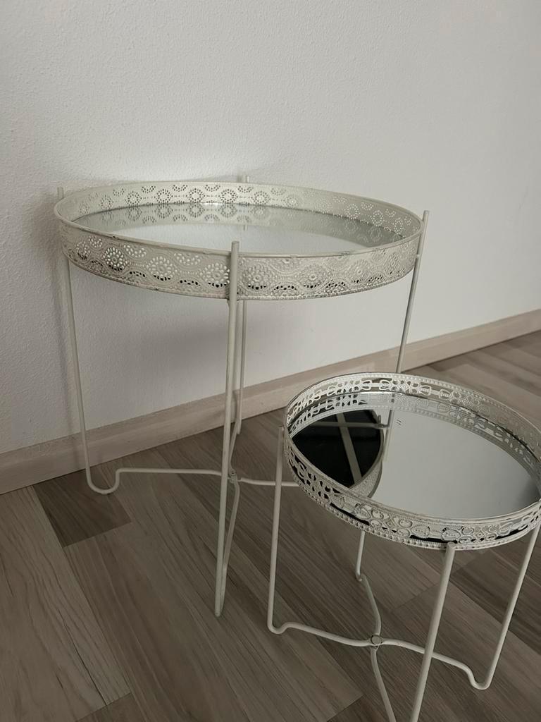Gratis op te halen! Set van twee witte bijzettafels met spiegelblad. De tafels zijn in goede staat en passen goed in een vintage of moderne inrichting. De grootste tafel is ongeveer 60 cm hoog, de kle