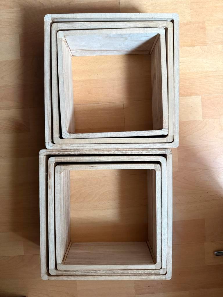 2x set van drie houten kubusplanken. Ze zijn in goede staat en kunnen gebruikt worden voor decoratie of opslag. De planken zijn van verschillende groottes en kunnen in elkaar worden geschoven.