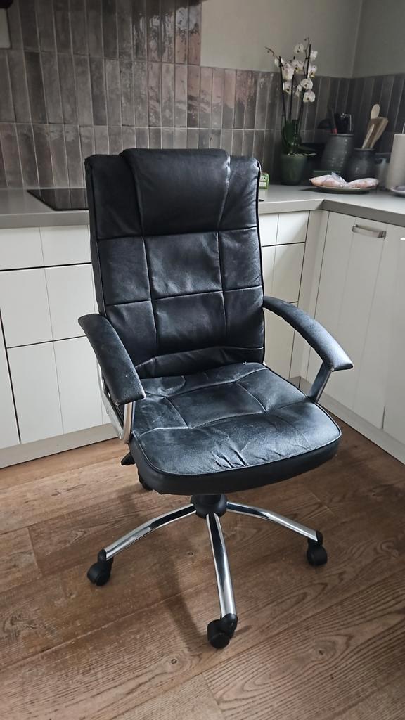Comfortabele bureaustoel, in goede staat. Zitting en rugleuning zijn bekleed met zwart leer. Gebruikt, maar kan nog prima een ronde mee. Eventueel te ruilen tegen een zakje haribo snoepjes!