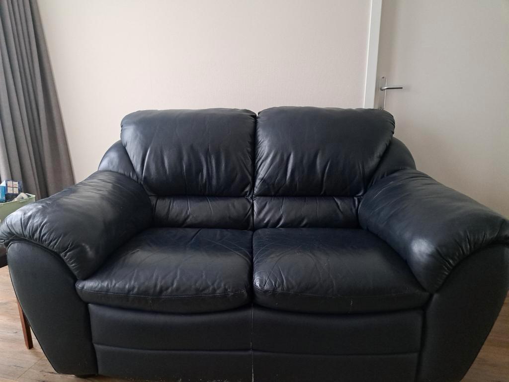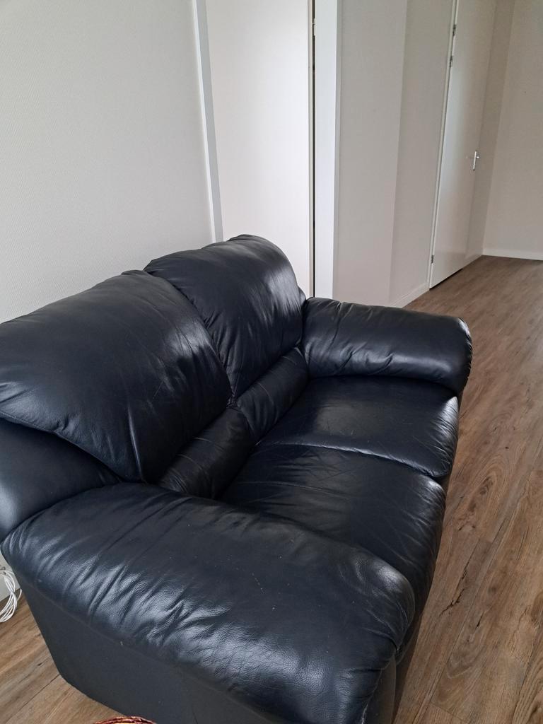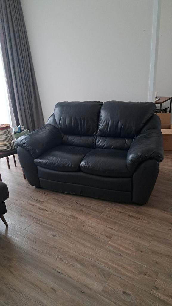 Af te halen zwarte bank 2 zits. Zit prima. Onderaan iets beschadigd. Kussens nog goed. Ongeveer 1,70 breed.