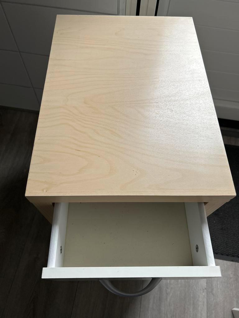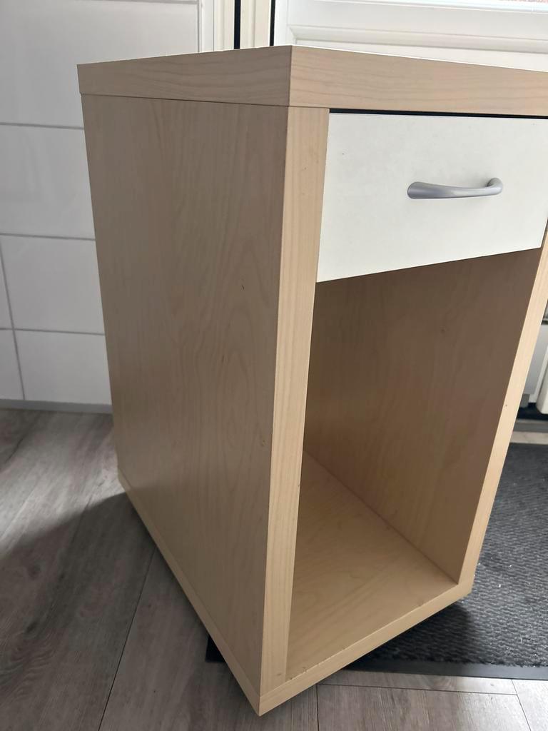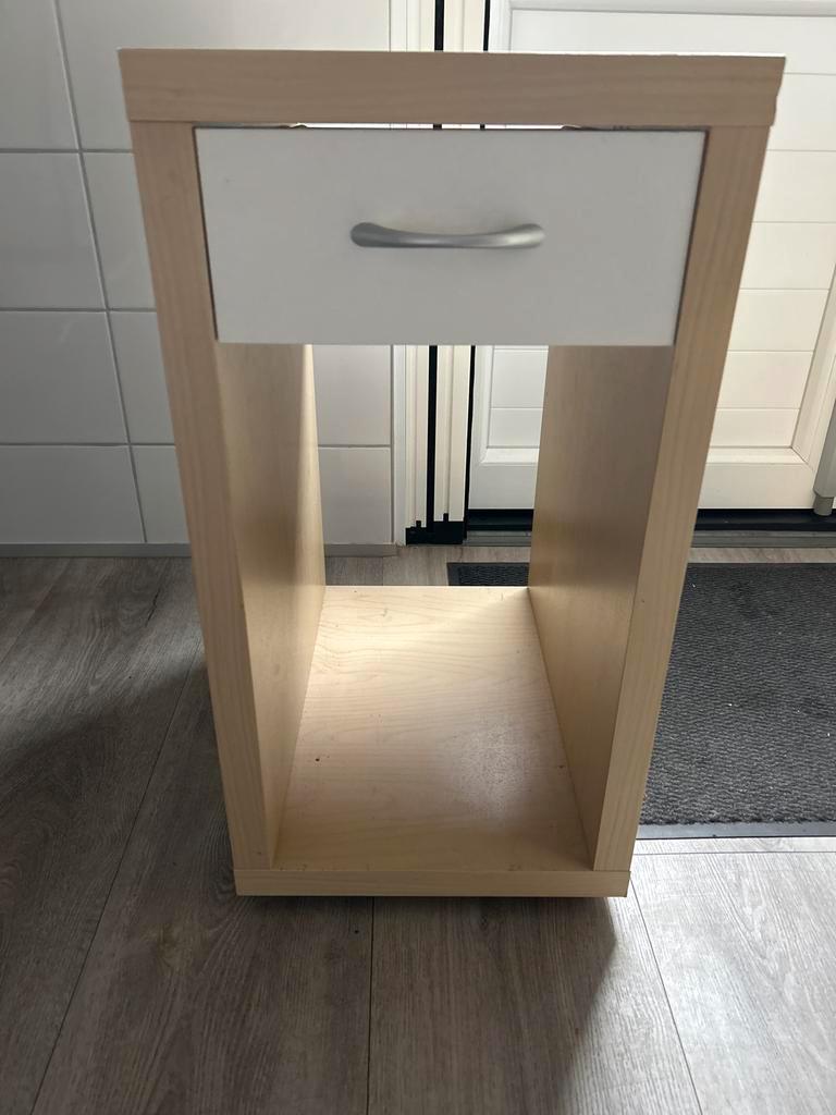 Gratis af te halen; handig klein kastje, ideaal voor onder een bureau of als nachtkastje. Het kastje heeft een lade voor het opbergen van kleine spullen en een open vak voor boeken of decoratie. Afmet