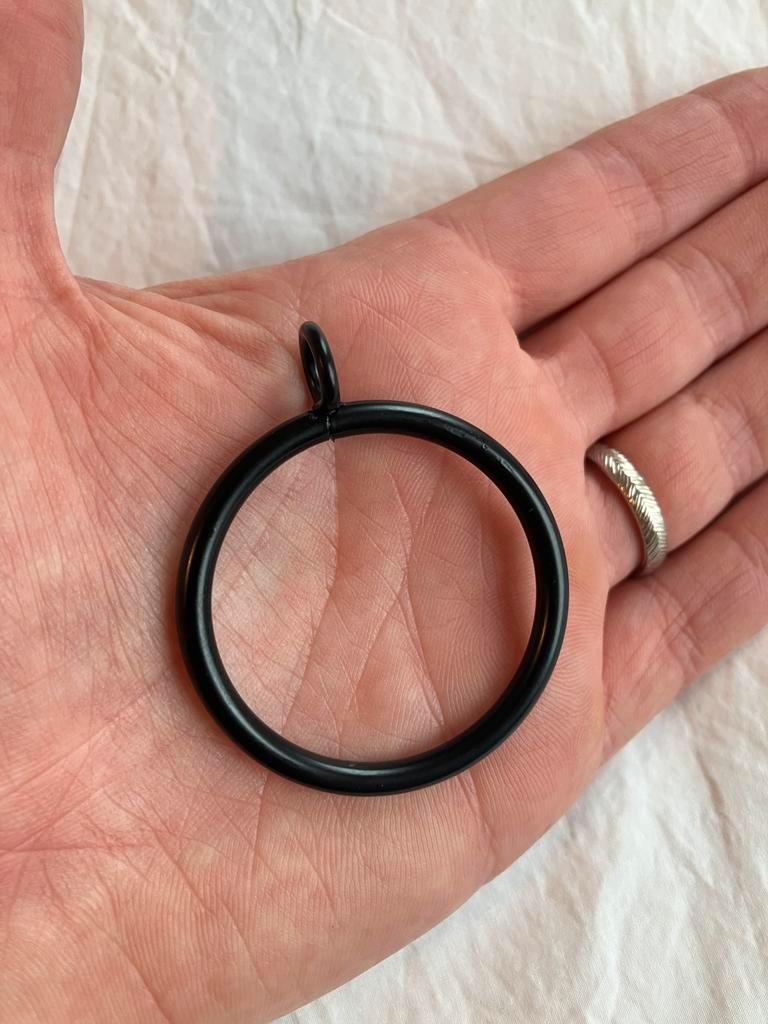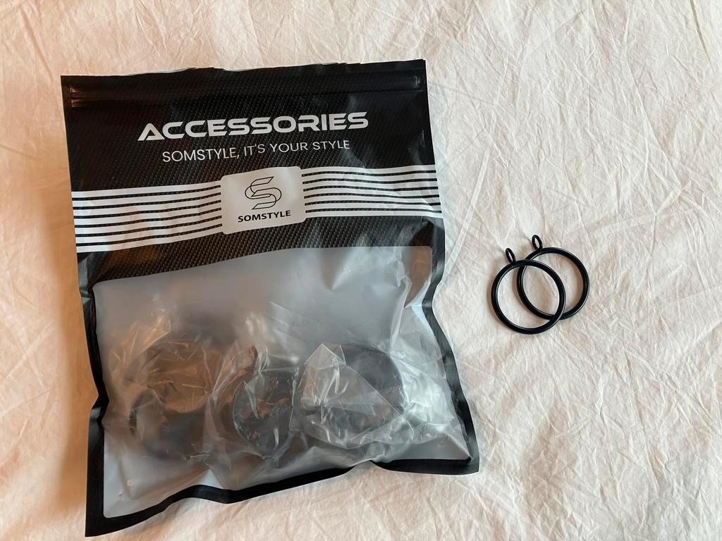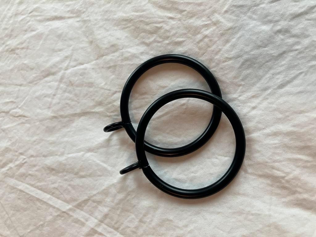 32 nieuwe, ongebruikte gordijnringen. Ze zijn over van een originele verpakking van 60 stuks. De andere 28 heb ik gebruikt en deze heb ik niet nodig. Ze zijn van goede kwaliteit, zwart metaal. De diam