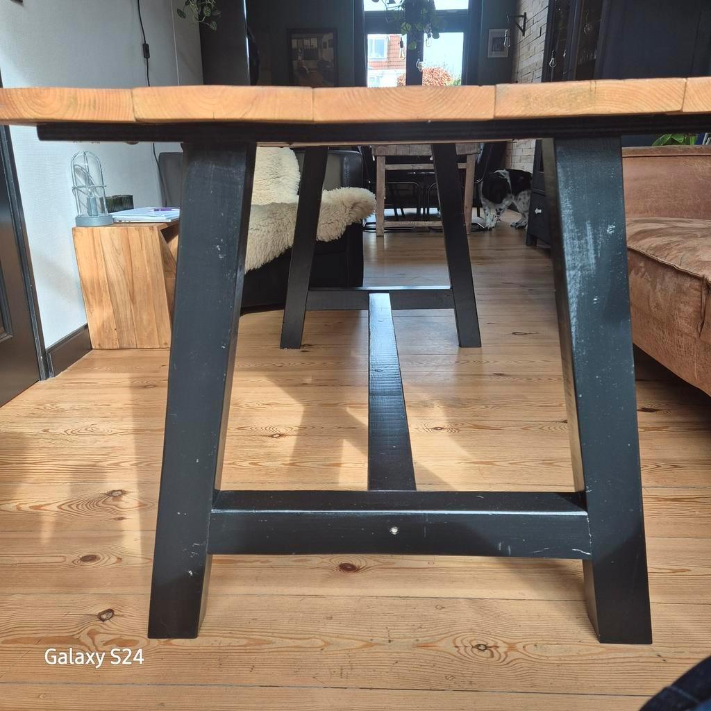 Mooie, robuuste houten eettafel. Perfect voor een gezellig diner met familie en vrienden. De tafel is in gebruikte staat, maar heeft nog veel karakter. Het hout heeft een warme uitstraling en past goe