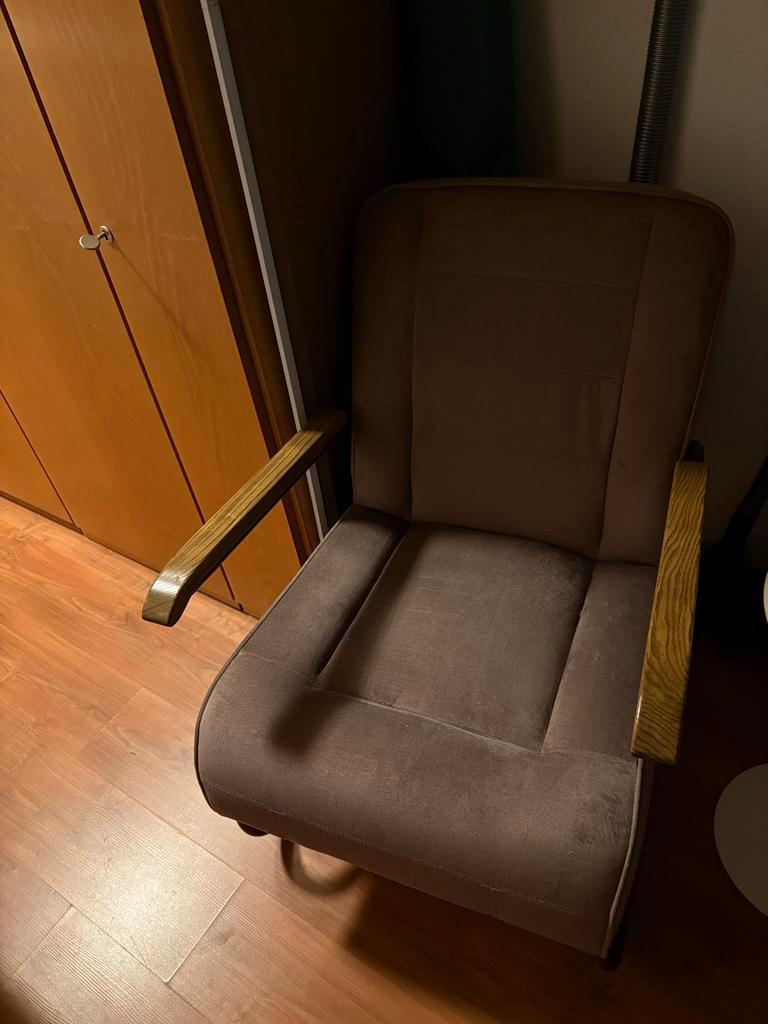 Een comfortabele fauteuil, perfect om in te ontspannen. De fauteuil is in goede staat en heeft een stevig frame. De bekleding is van stof en de armleuningen zijn van hout. Ideaal voor de woonkamer of