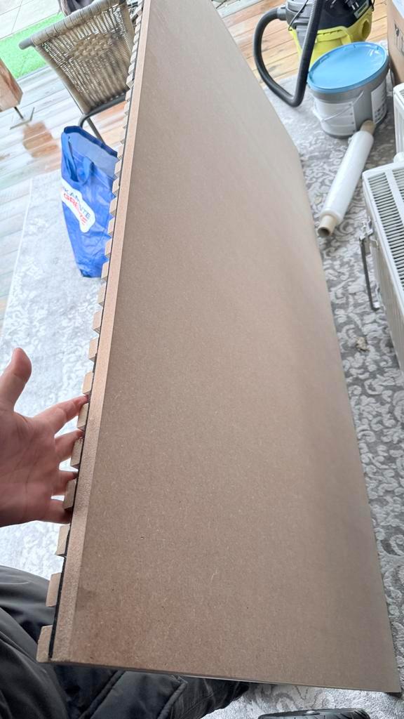 Akoestisch wandpaneel met zwarte en houten latten. Ideaal om de akoestiek in een ruimte te verbeteren en tegelijkertijd een stijlvolle uitstraling te geven. Het paneel is in gebruikte staat, maar func