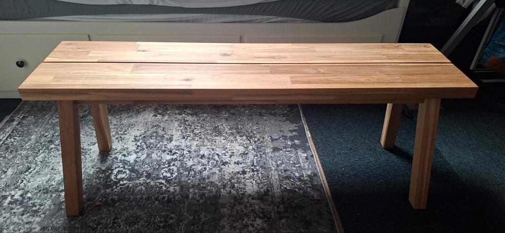 Mooie houten bank, ideaal als zitbankje of bijzettafel. Afmetingen: 120 cm breed, 29 cm diep en 45 cm hoog. Stevig en in goede staat.