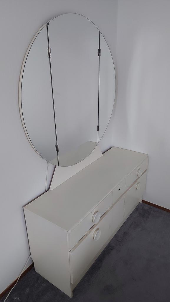 Mooie spiegel met meubel combinatie. De afmetingen zijn 115 cm breed, 35 cm diep en 160 cm hoog (waarvan 54,5 cm het kastje is en 105,5 cm de spiegel). Ideaal voor de slaapkamer of badkamer. Ophalen i