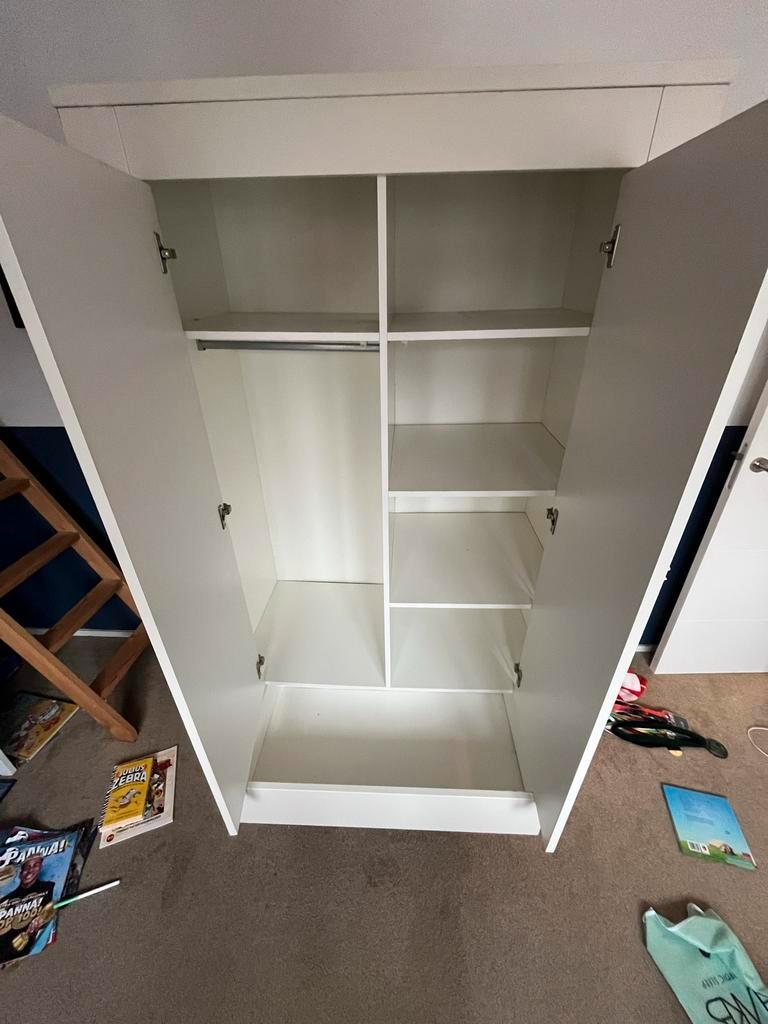 Leuke en praktische kinderkledingkast. Ideaal voor het opbergen van kleding en speelgoed. De kast is voorzien van planken en een hanggedeelte. Afmetingen zijn geschikt voor een kinderkamer.