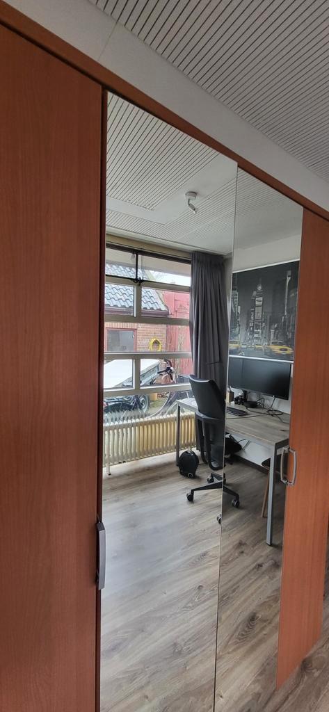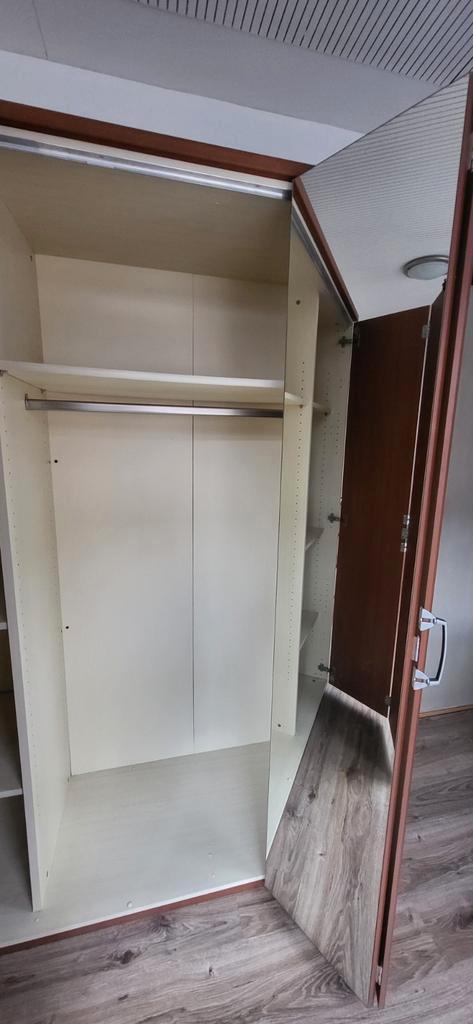 Gratis ophalen: grote kledingkast met schuifdeuren. De linkerdeur kregen wij niet goed in de rail. Maar een kleinigheid voor de handige klusser. Aan de linkerzijde een lichte beschadiging. Rest is nog