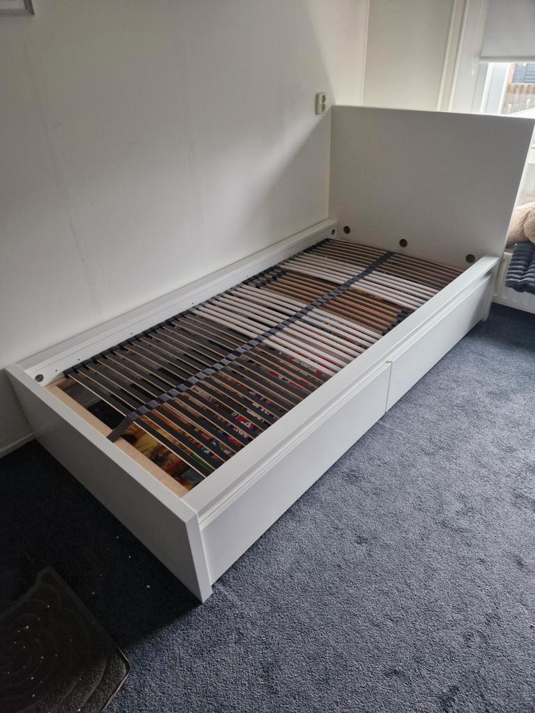 Gratis af te halen: ikea bedframe met lattenbodem. Geschikt voor een matras van 90cm bij 200cm. Het frame is 115.5Cm breed, 209cm lang en 100cm hoog bij het kopschot. Het bed kan uit elkaar gehaald wo