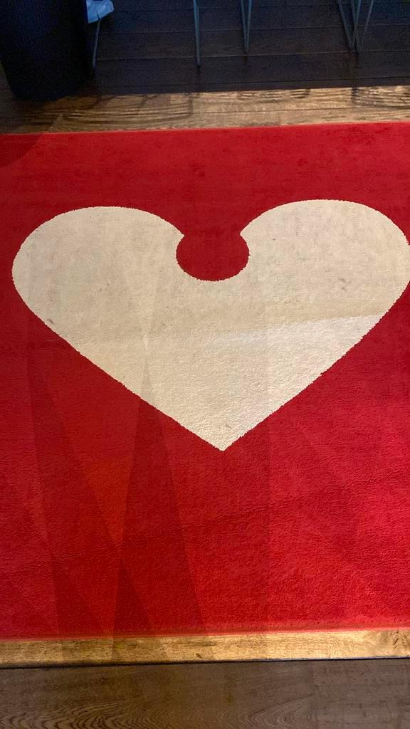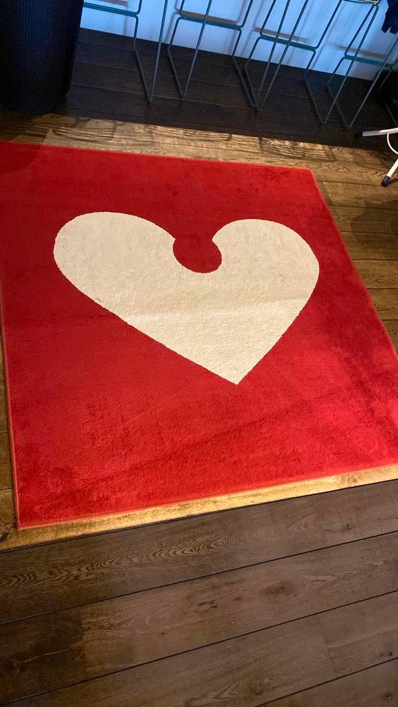Vierkant vloerkleed, rood met een witte, hartvormige sneeuwvlok in het midden. Reiniging aanbevolen. 1M65 op 1m65 ophalen in poppel, belgië