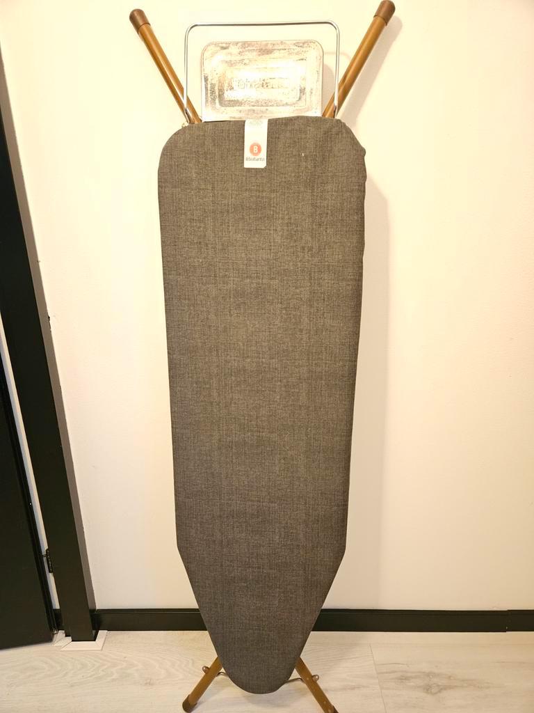 Brede strijkplank van brabantia niet mooi maar nog wel goed bruikbaar. De strijkplank overtrek is weinig gebruikt.