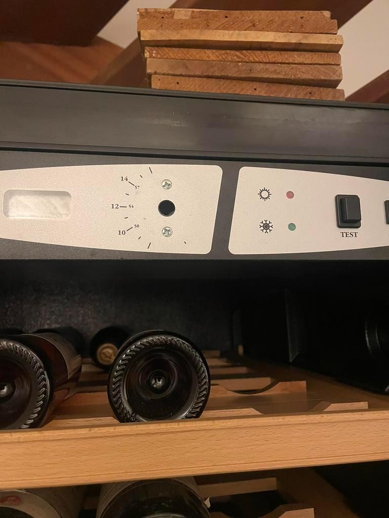Wijnkoelkast met 13 prachtige houten planken voor 12 flessen per plank. Merk transtherm (is overgenomen door eurocave). Onderaan nog ruimte voor 6 grote flessen. Koeling is defect. Te koop zonder de i