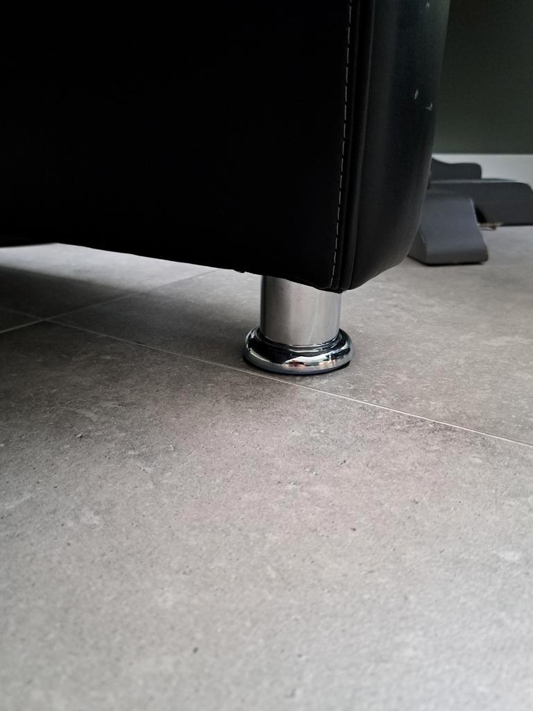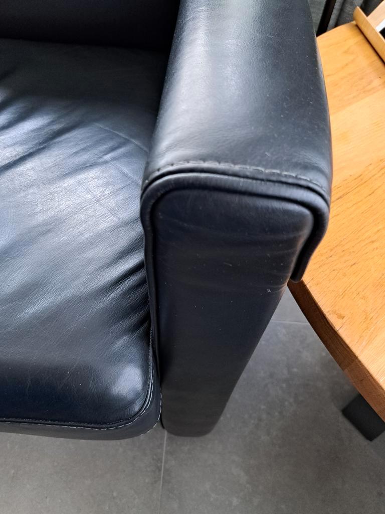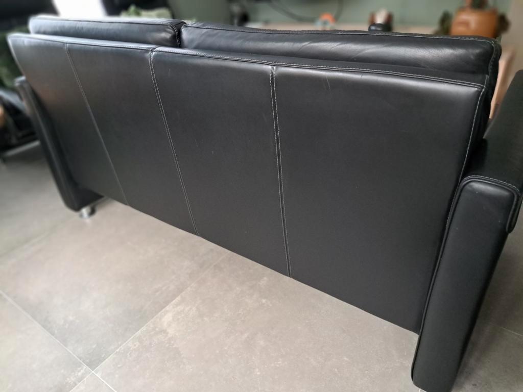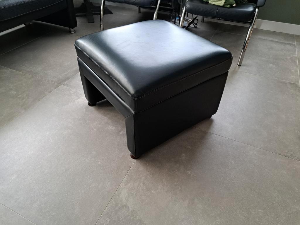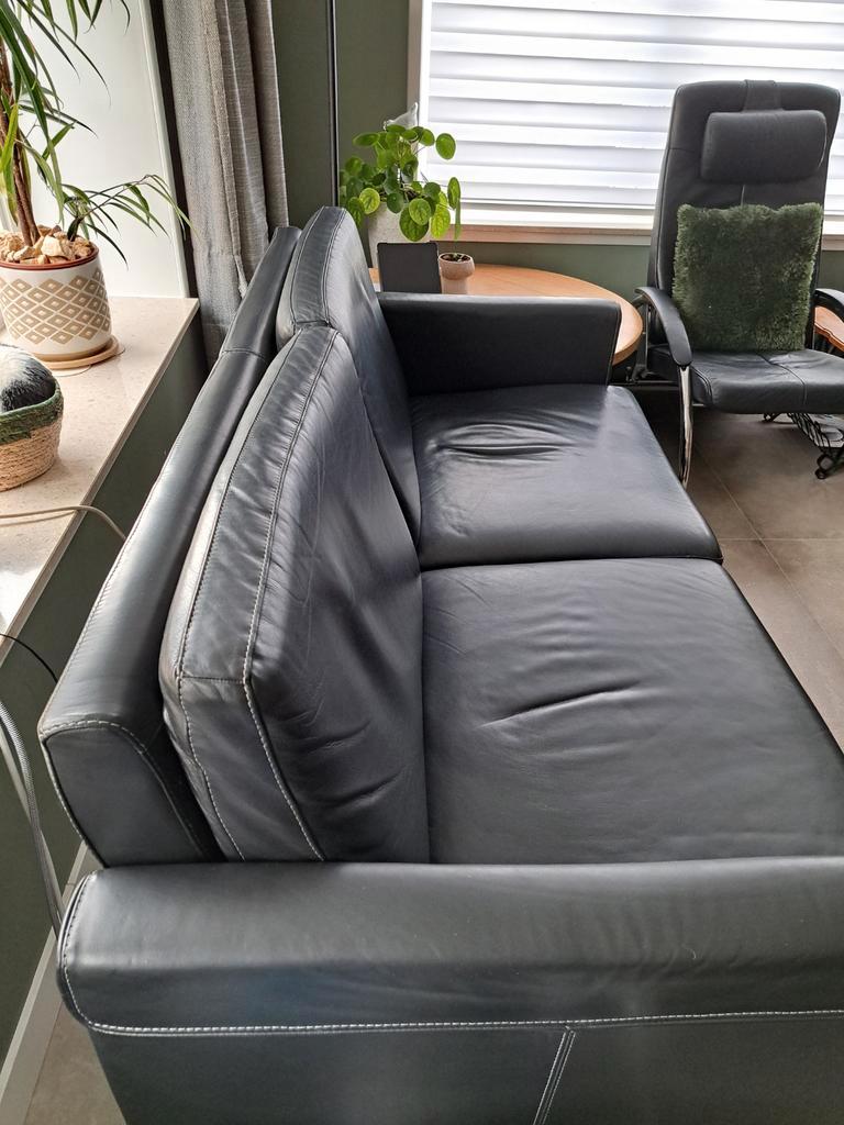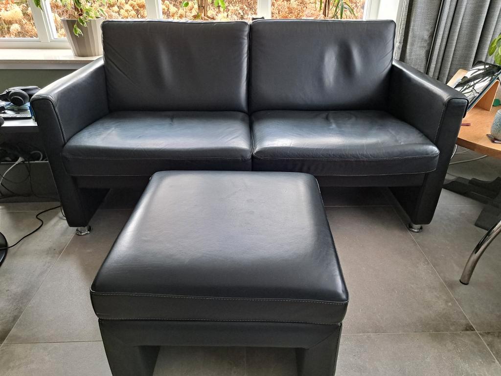 Mooie zwarte leren tweezitsbank met bijpassende voetenbank/poef. De bank en voetenbank zijn in nette staat en bieden comfortabele zitplaatsen. Ideaal voor een kleinere woonkamer of als extra zitplek.