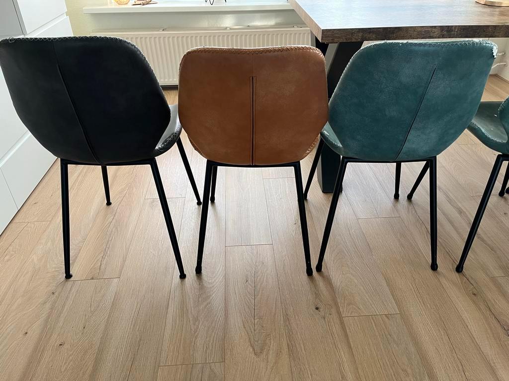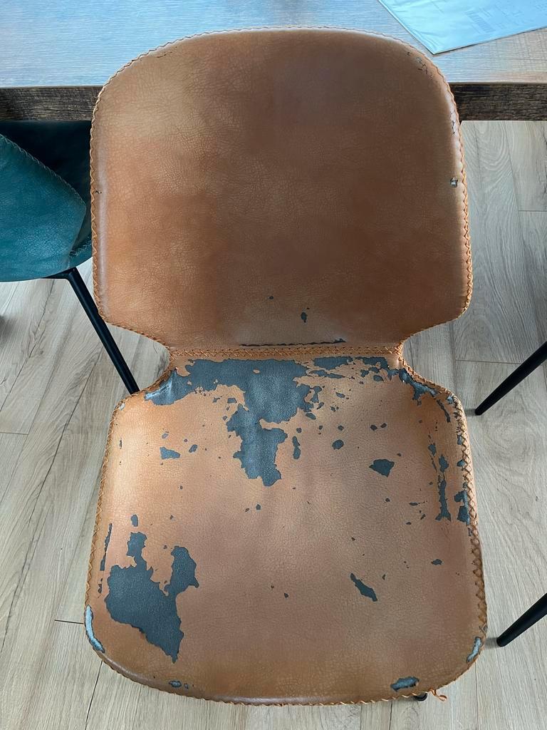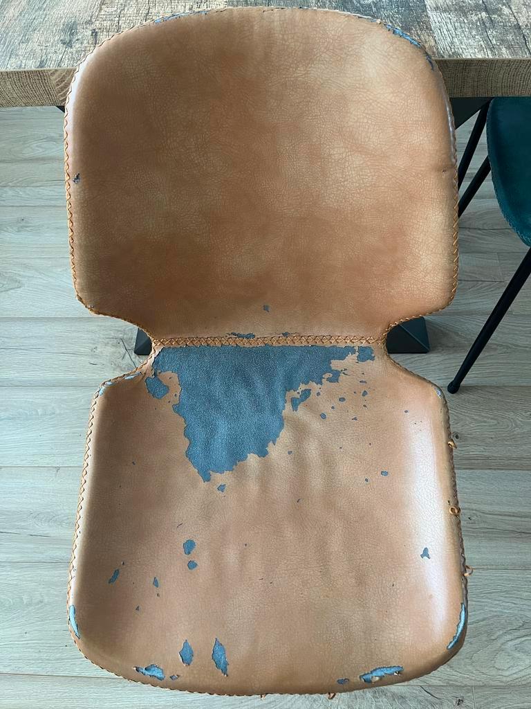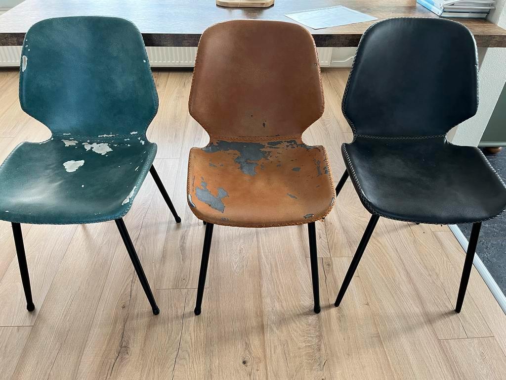 Set van 6 seashell stoelen, 2 x cognac, 2 x blauw en 2 x zwart. Alle stoelen zitten prima! Wel zijn ze allemaal beschadigd op de zitting. De één heel erg, de ander een klein beetje. Zie hiervoor de fo