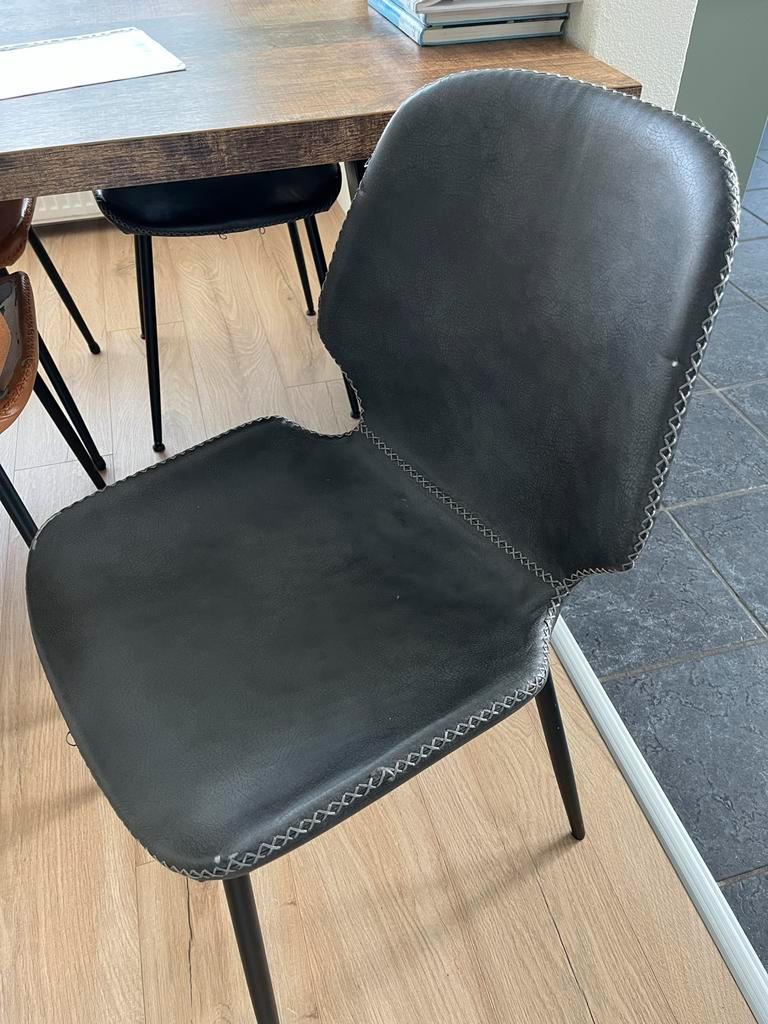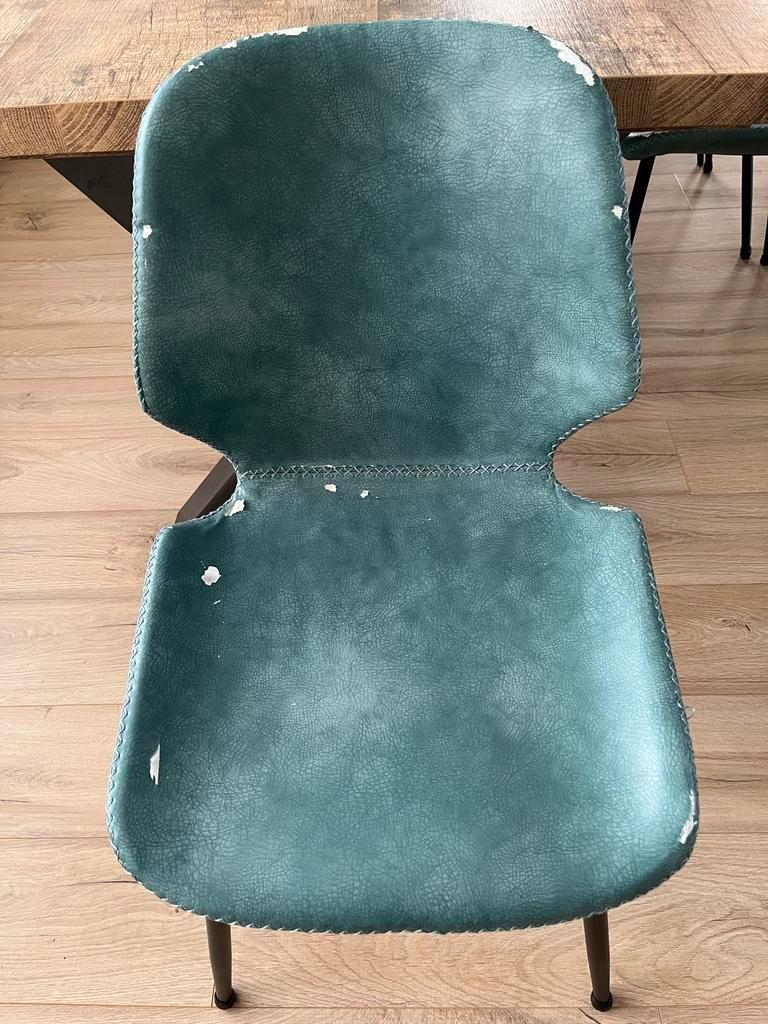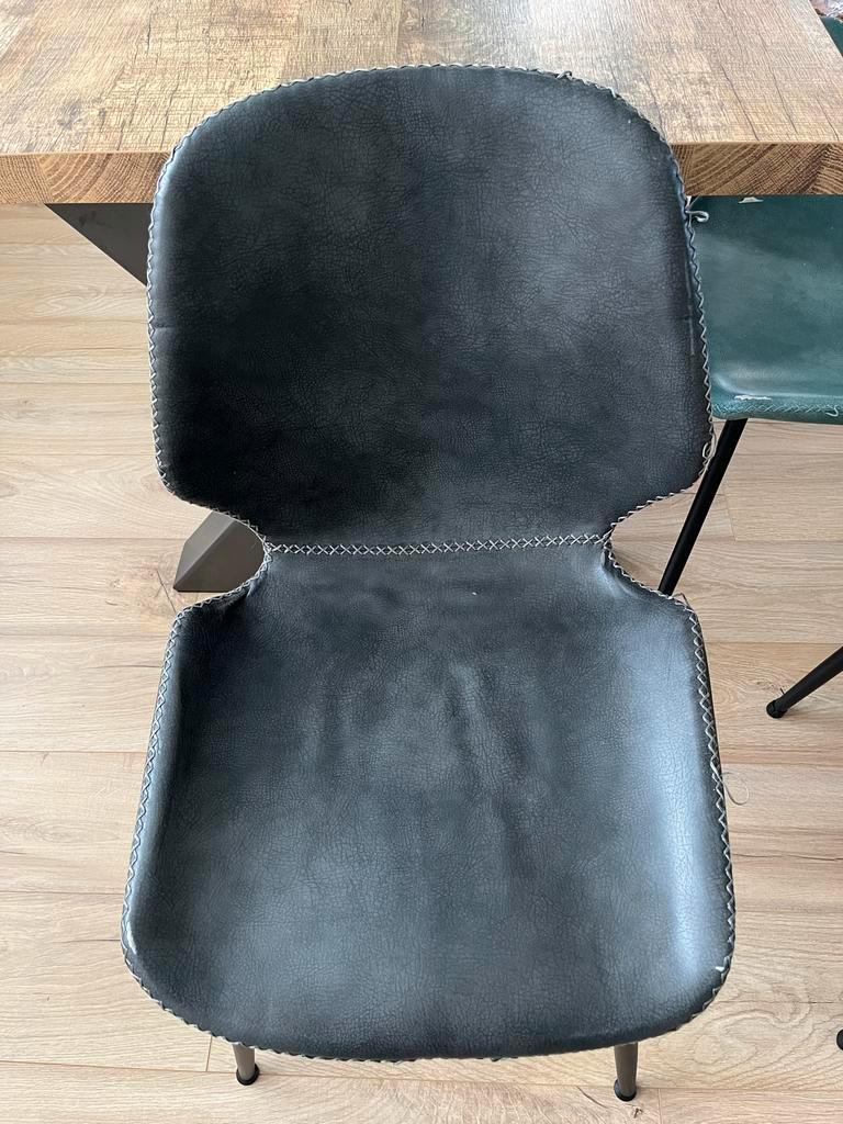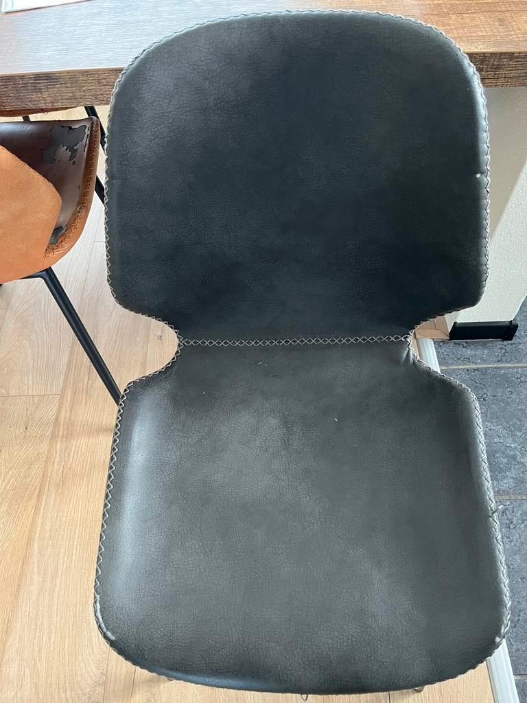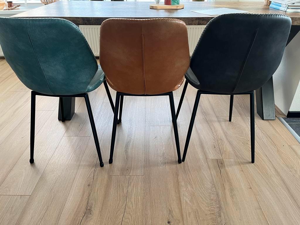 Set van 6 seashell stoelen, 2 x cognac, 2 x blauw en 2 x zwart. Alle stoelen zitten prima! Wel zijn ze allemaal beschadigd op de zitting. De één heel erg, de ander een klein beetje. Zie hiervoor de fo