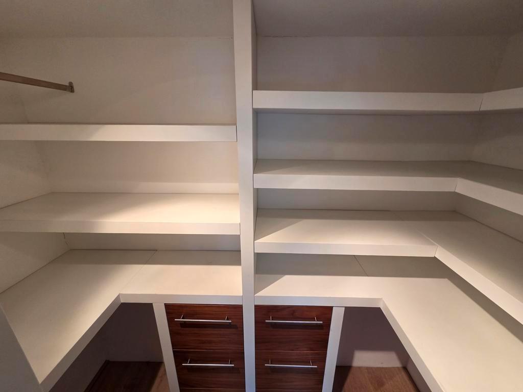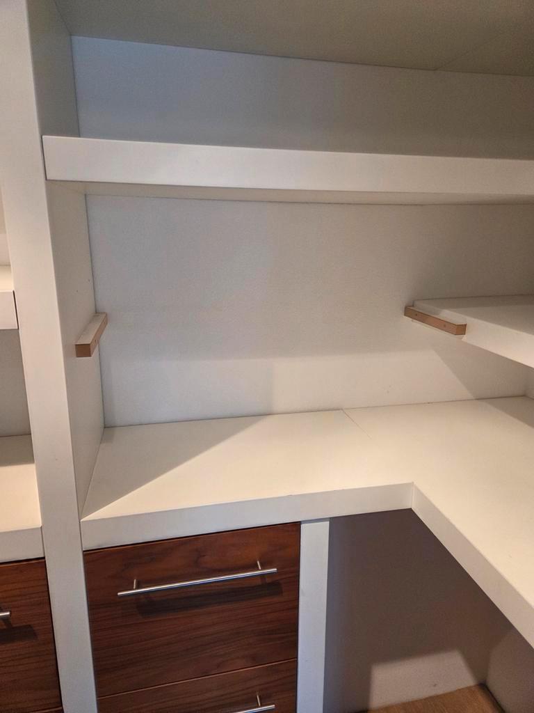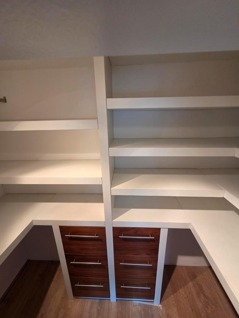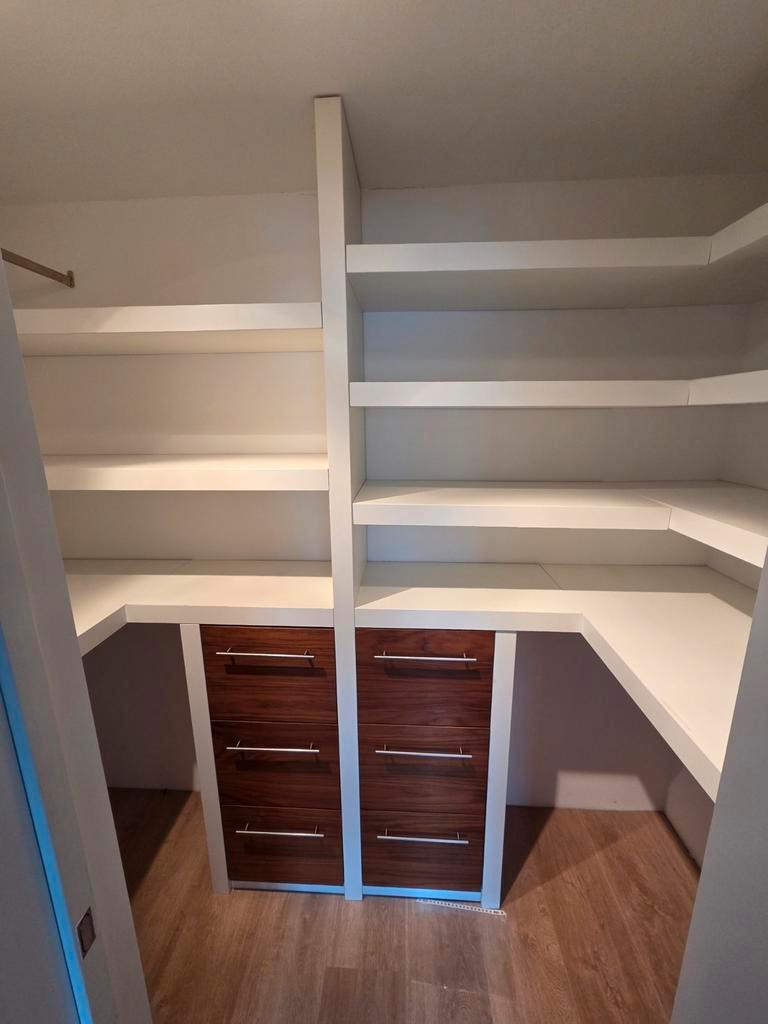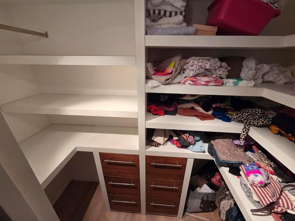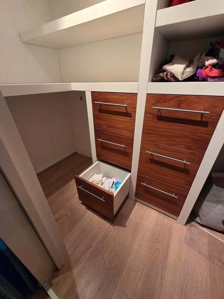 Ruime inloop kledingkast met lades en planken. Ideaal voor het opbergen van kleding en andere spullen. De kast is in goede staat en biedt veel opbergruimte. De hoogte 233cm maar aan te passen, de bree