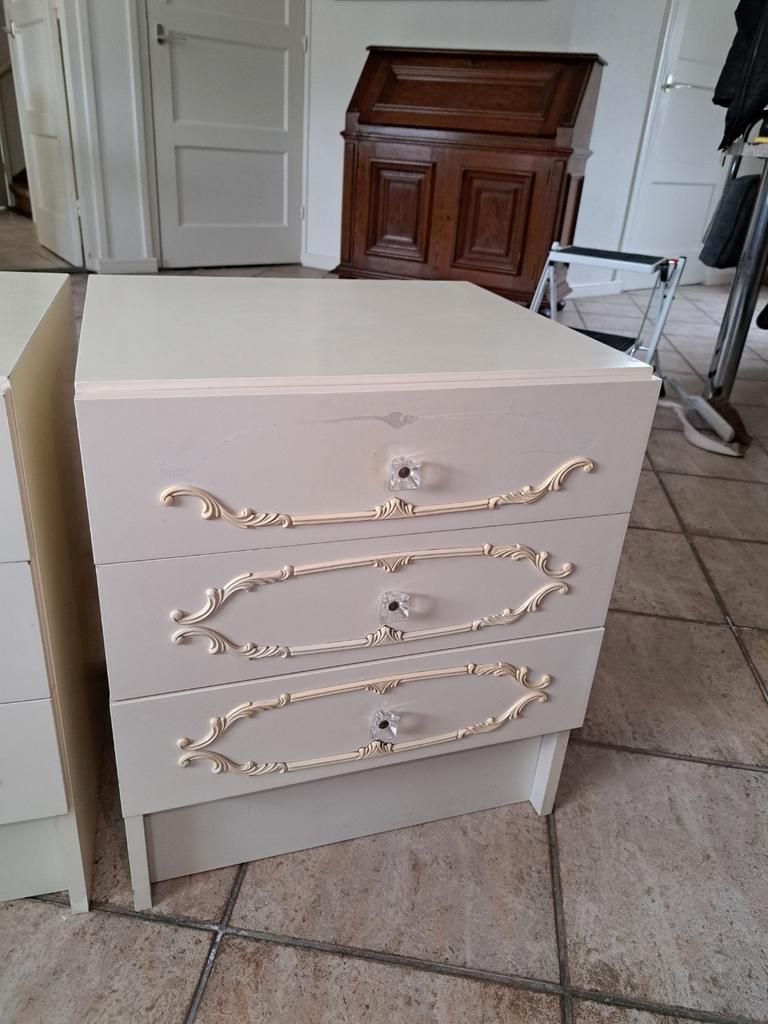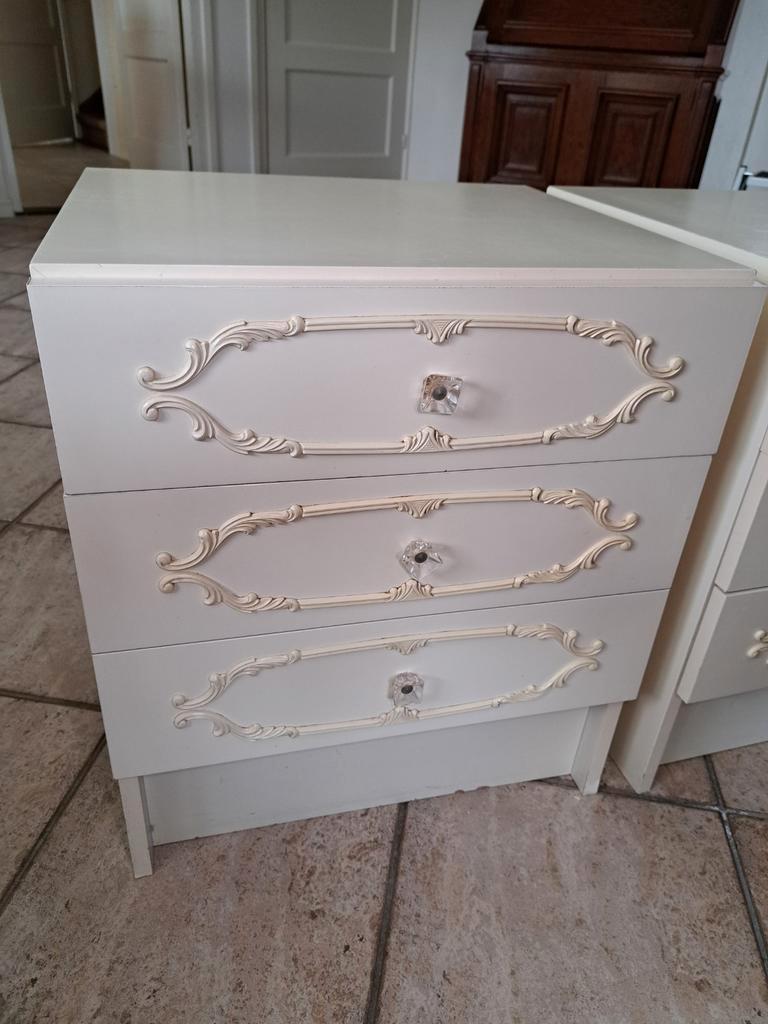 Set van twee vintage nachtkastjes. Gebruikte staat, maar met karakter. Ideaal voor een retro of brocante inrichting. Afmetingen: 47 cm breed, 42 cm diep, 55cm hoog. Materiaal: mdf