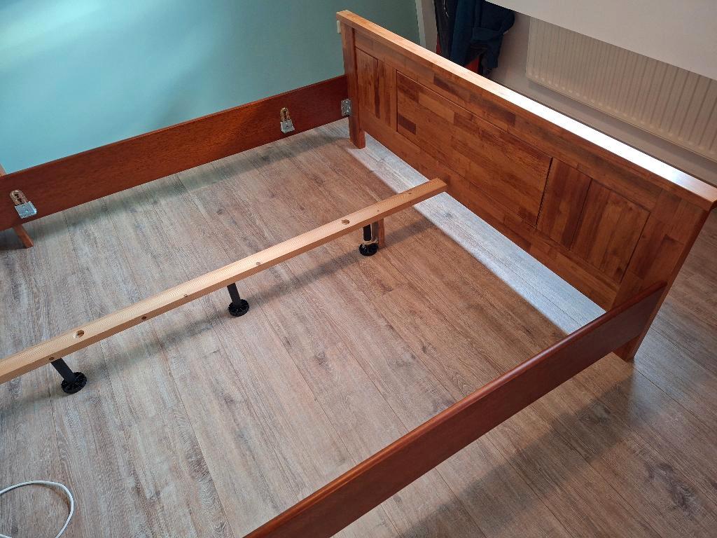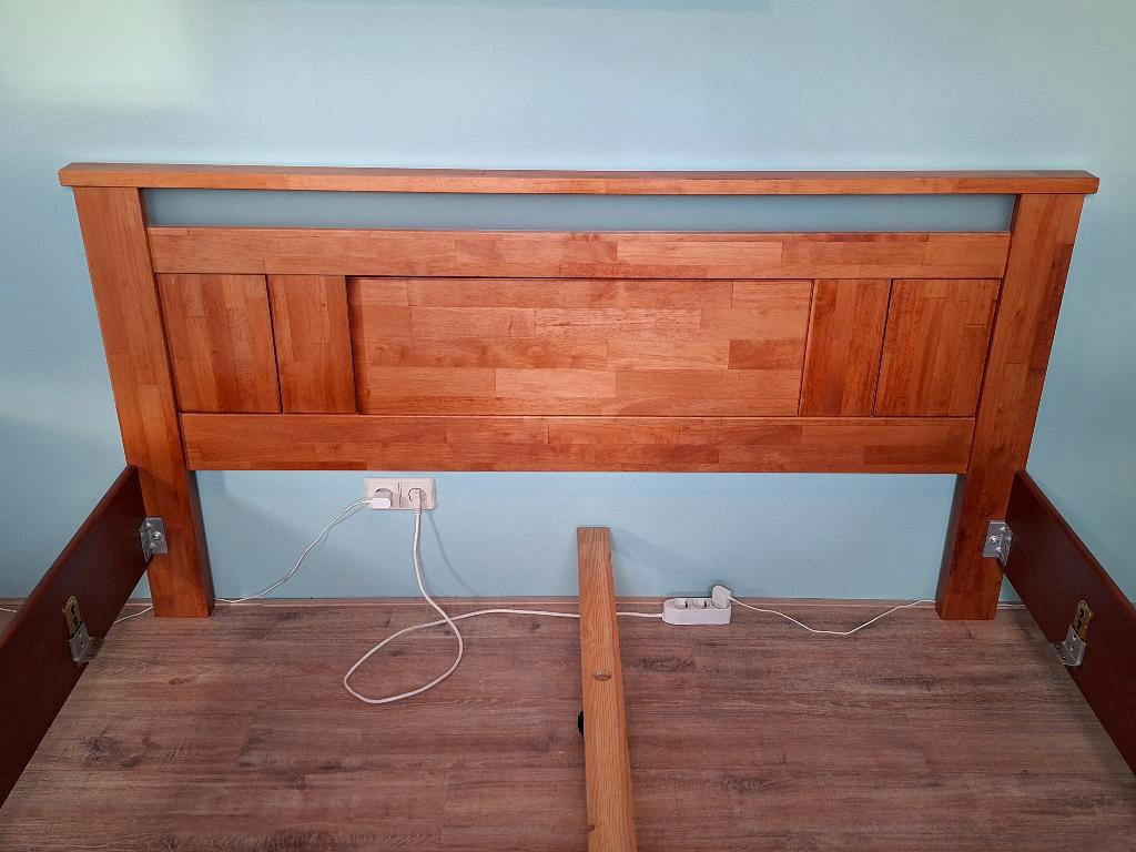 Ledikant met twee losse lattenbodems, waarvan eentje met verstelbaar hoofd en voeten einde. Afmetingen 180 cm breed en 200 cm lang. Afmetingen hoofdbord 190 cm breed en 100 cm hoog