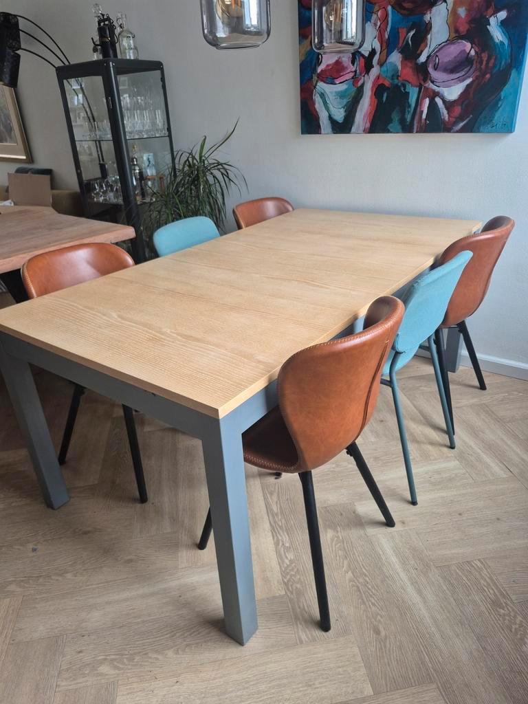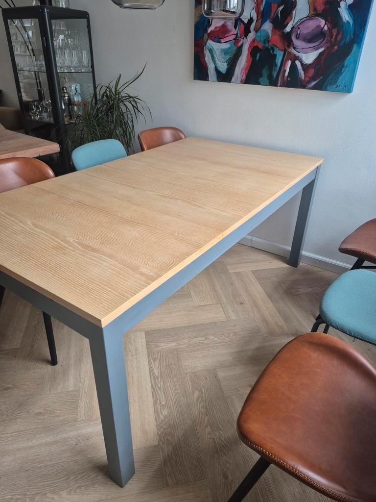 Gebruikte ikea eettafel. De tafel is 175cm lang en 95cm breed, en 74.5Cm hoog. De tafel is uitschuifbaar tot een maximale lengte van 260cm. Er is een beschadiging op één van de randen door het schuren
