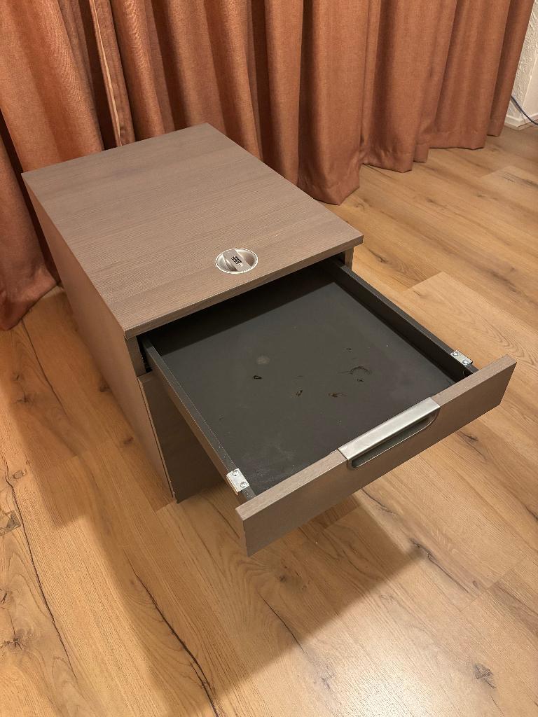 Een handig kastje op wielen voor onder het bureau. Voorzien van codeslot. Hier en daar wel wat gebruikssporen zichtbaar.
