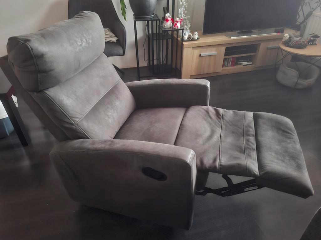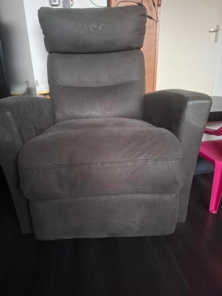 Antraciet grijze relaxfauteuil in gebruikte staat. Hij is van stof en een handmatige verstelhendel aan de zijkant. Het zitoppervlak is 57cm diep en 55cm breed. Zithoogte is ong. 42 Cm. Gratis op te ha