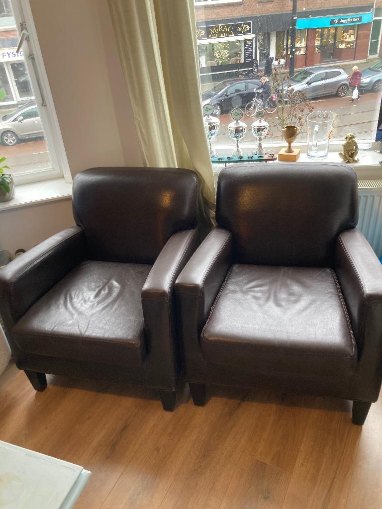 2 leren bruine stoelen van goede kwaliteit voor 30,- bij elkaar.