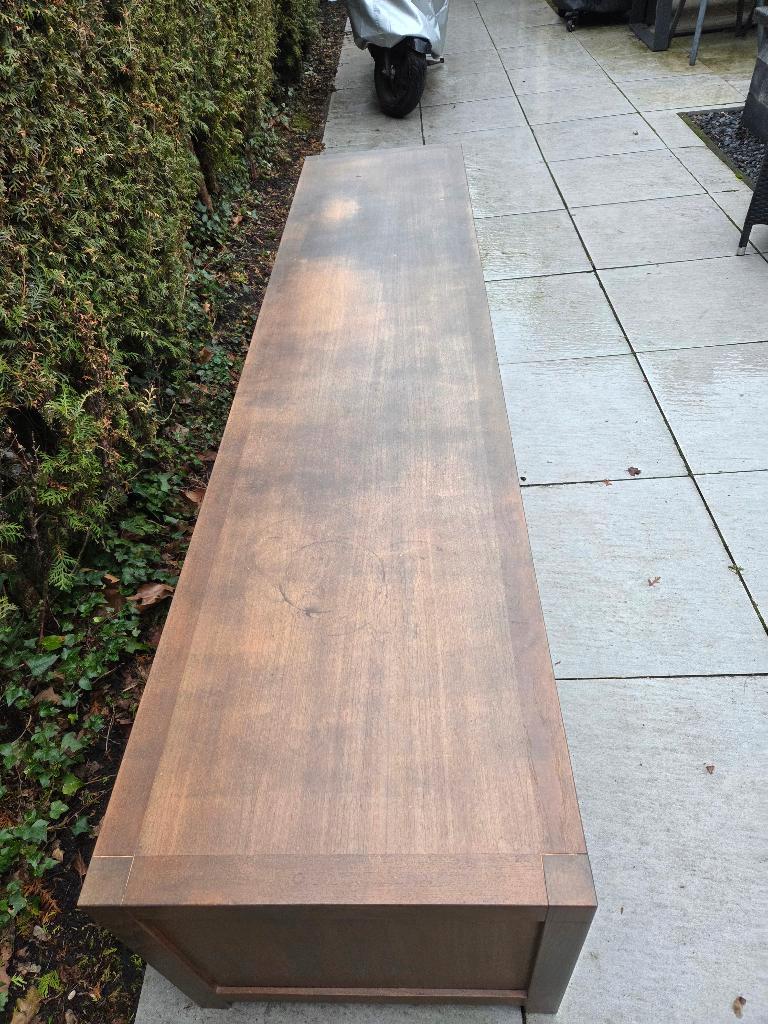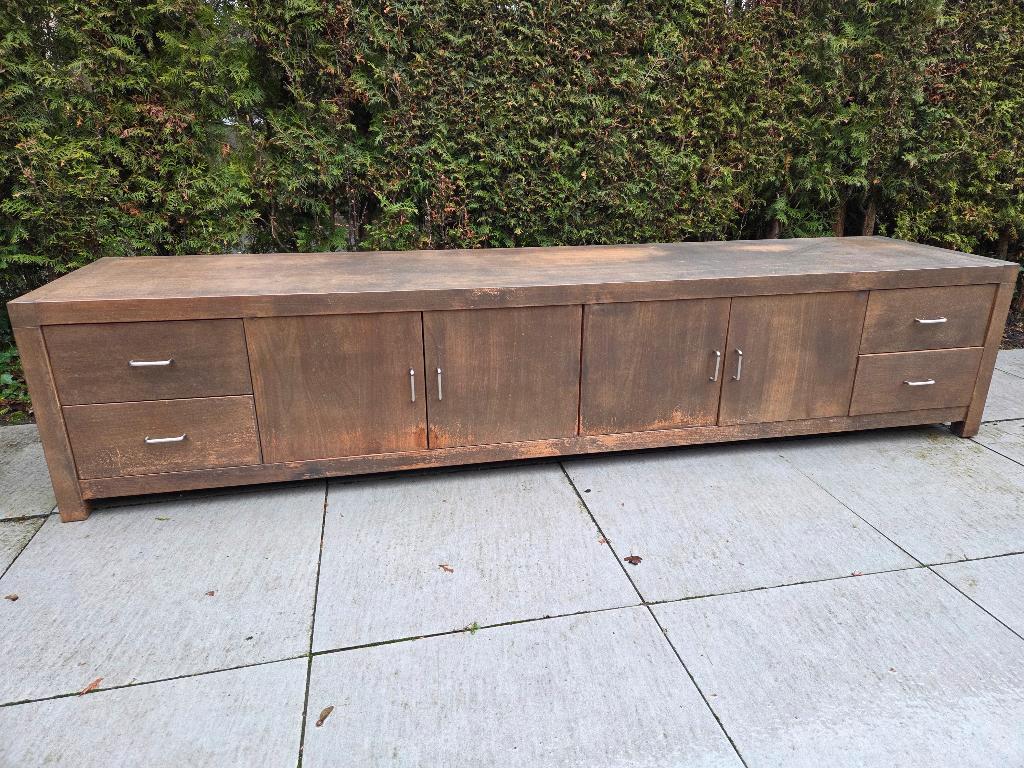Massief houten tv kast. 240X45cm. Met wat liefde en een likje verf kan hij nog heel lang mee. Direct op te halen!