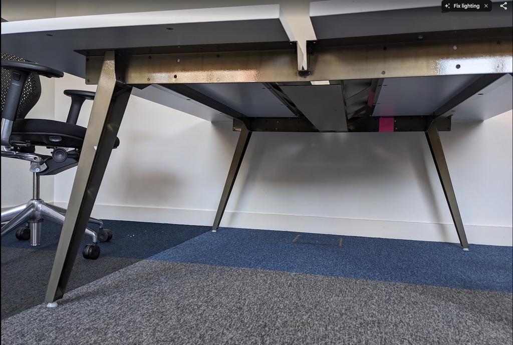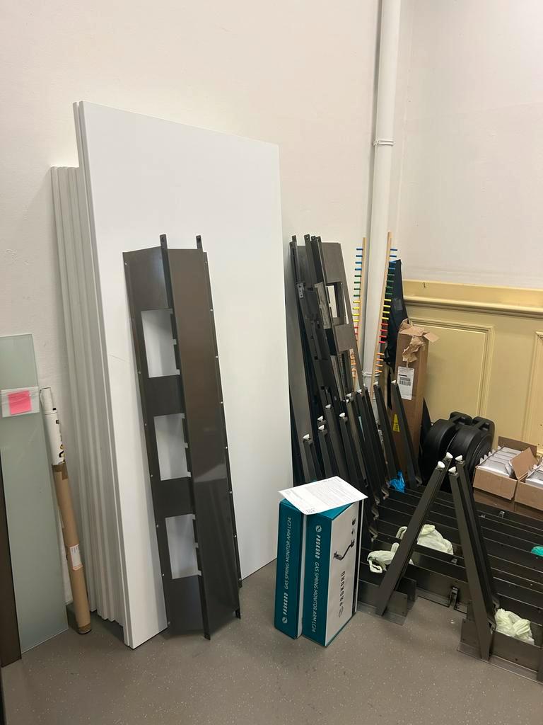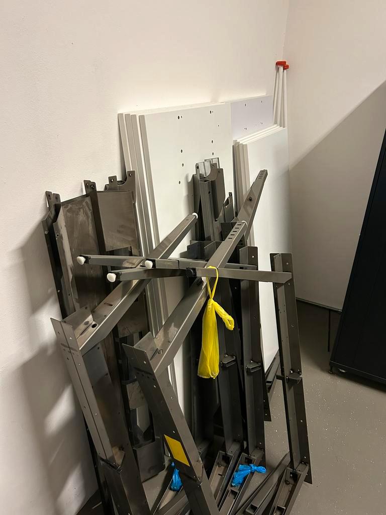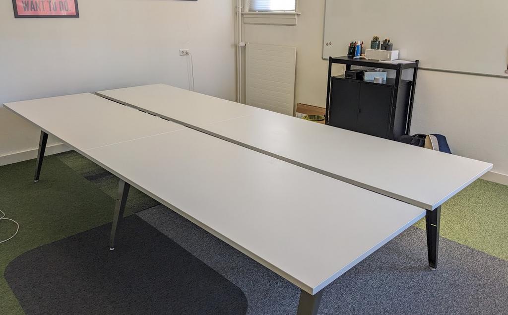 3 x opstelling voor 2 mensen, dit zijn de 6 bureau’s van 160x80 (per 2 gemonteerd) 3 x opstelling voor 4 mensen, dit zijn de 12 bureau’s van 180x80 (per 4 gemonteerd) 1 x opstelling voor 2 mensen, dit