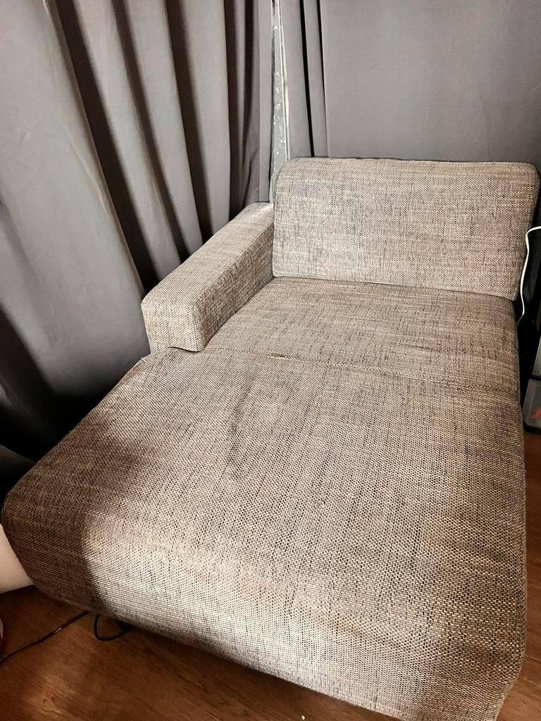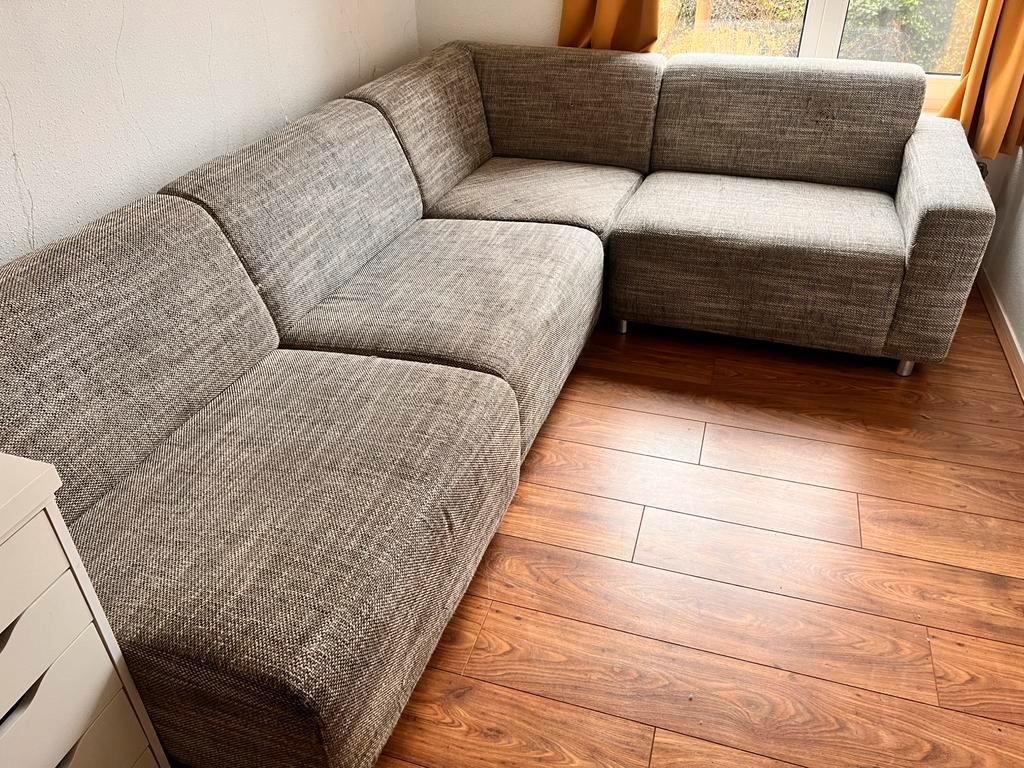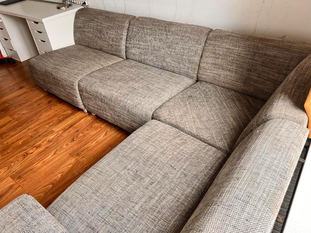 In het kort : 4/5 losse delen (85–150 cm) modulaire bank met losse elementen, makkelijk zelf in te delen. Gebruikt, maar nog prima bruikbaar. Elementen: 85x90 (2x) – 90x90 – 100x90 – 100x150 cm klein