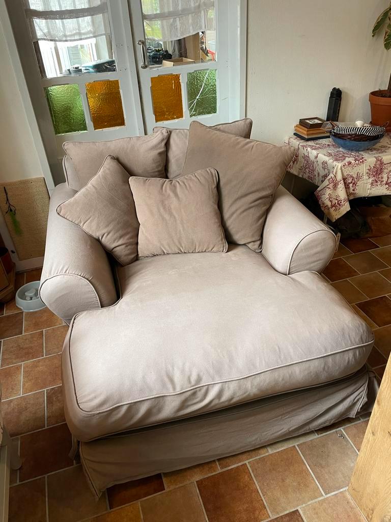 Comfortabele lounge stoel / relax stoel. Afmetingen: 140 cm lang, 125 cm breed en 76 cm hoog. Er is een kleine schoonmaakvlek aanwezig die een kleurverschil veroorzaakt. Gratis op te halen! Kan tegen