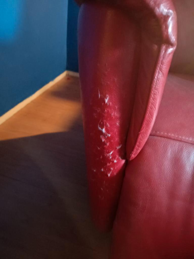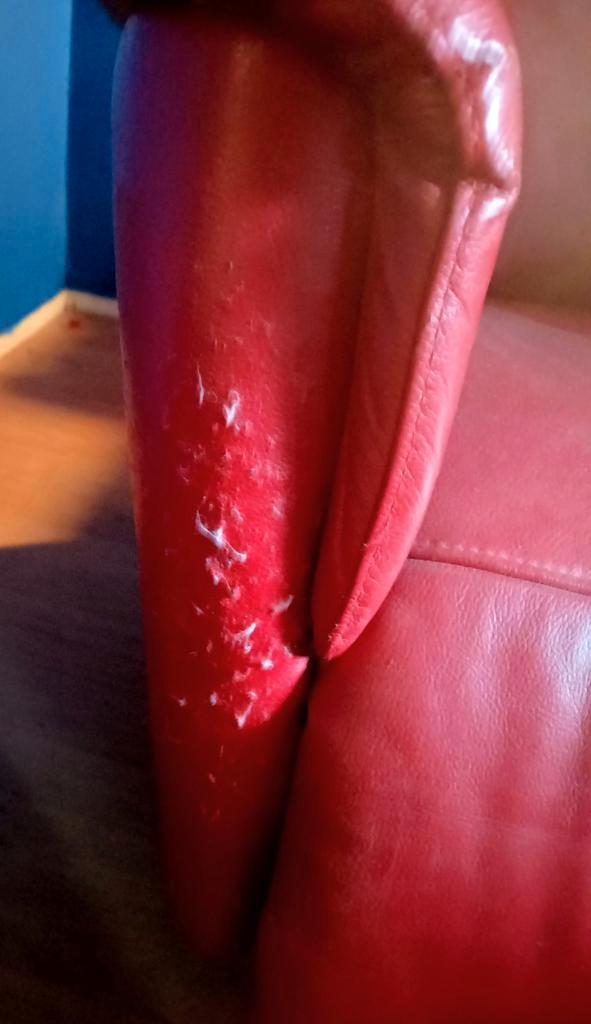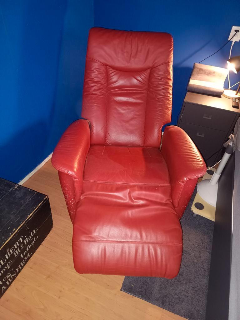 Comfortabele, nog goed werkende relex stoel in de kleur rood. Ideaal om te ontspannen. Gebruikt. Be schadiging aan de zijkant/ achterkant, zie foto''s. Kan je gemakkelijk weer net jes maken met een
