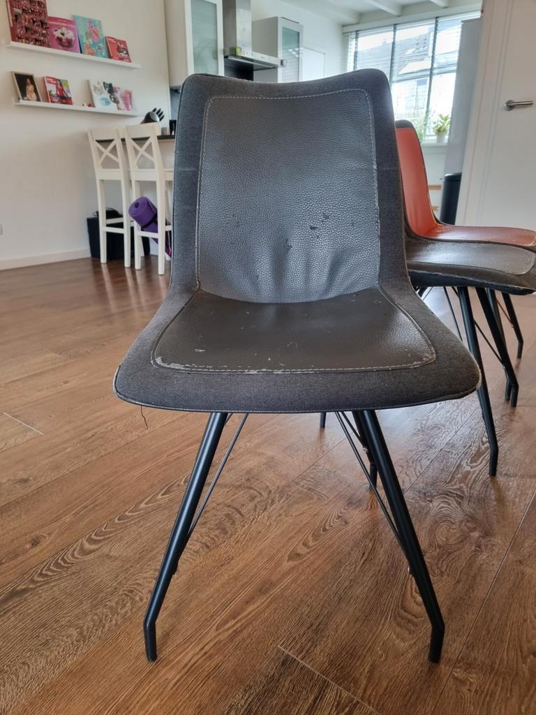 Set van 6 xooon jax stoelen. De stoelen zijn bekleed met stof en leer(look) en hebben een metalen frame. De stoelen zijn gebruikt (10 jaar oud). De bekleding is niet netjes meer. Ze zijn wel heel comf