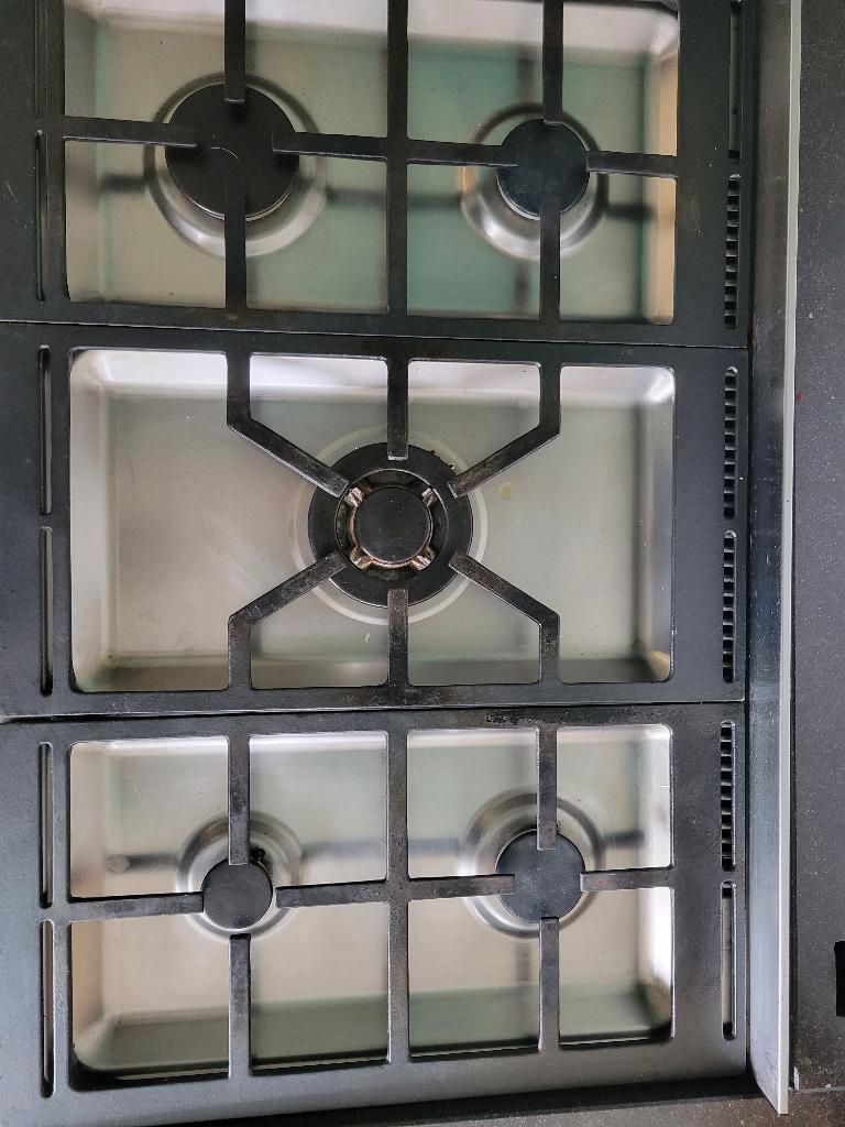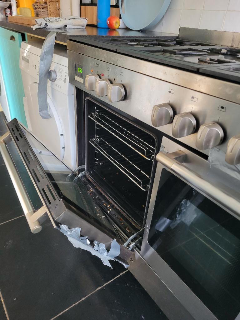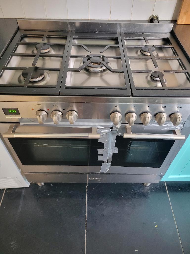 Fratelli gasfornuis – 5-pits afmetingen: 90 cm x 67 cm, hoogte 92 cm. Voorzien van 5 gaspitten die goed werken. Met twee elektrische ovens: 1 grote en 1 kleine — beide functioneren. De sluitmechanisme
