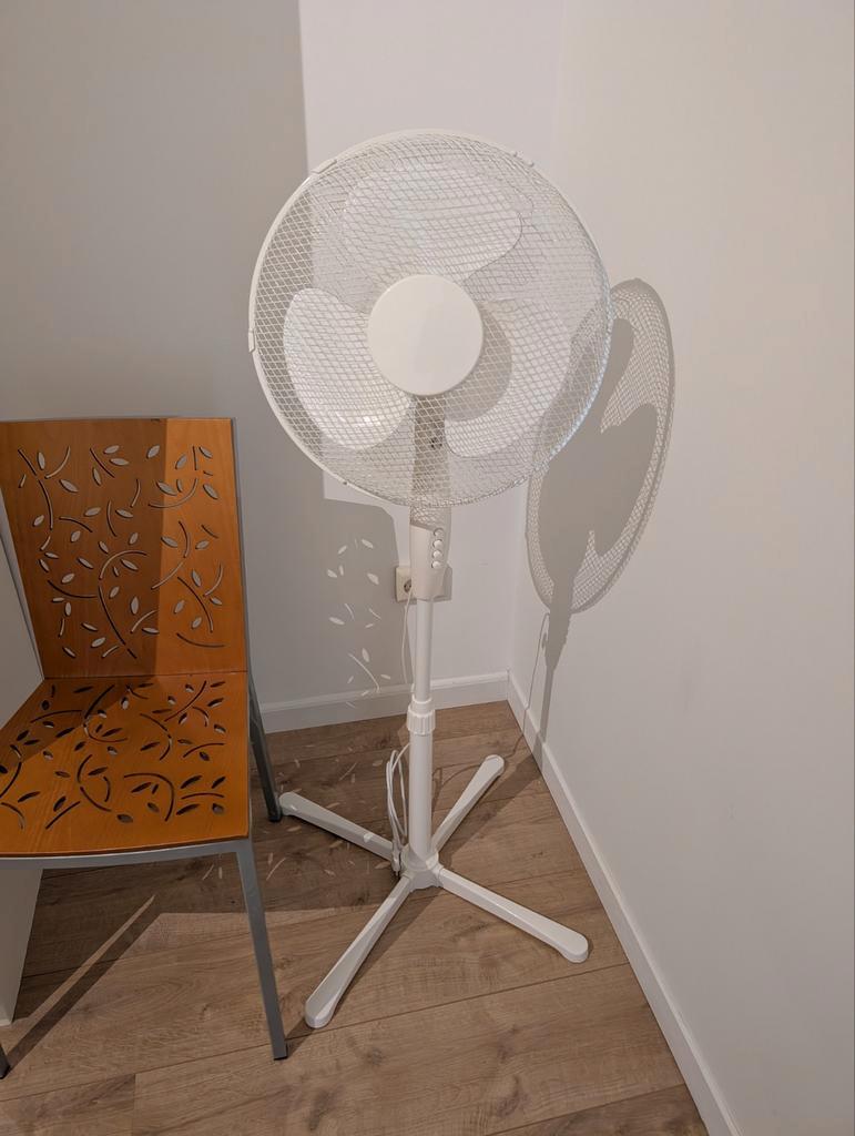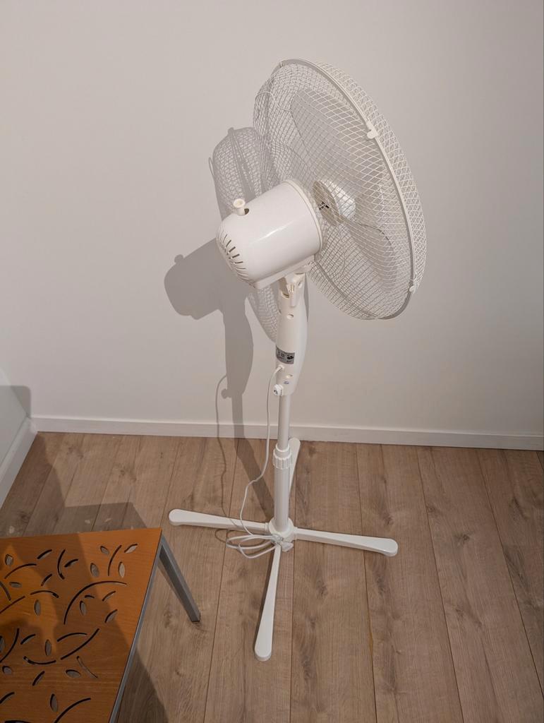 Staande ventilator, zo goed als nieuw, volledig werkend. Verstelbare hoogte (100-120 cm), 3 snelheden, 45w.