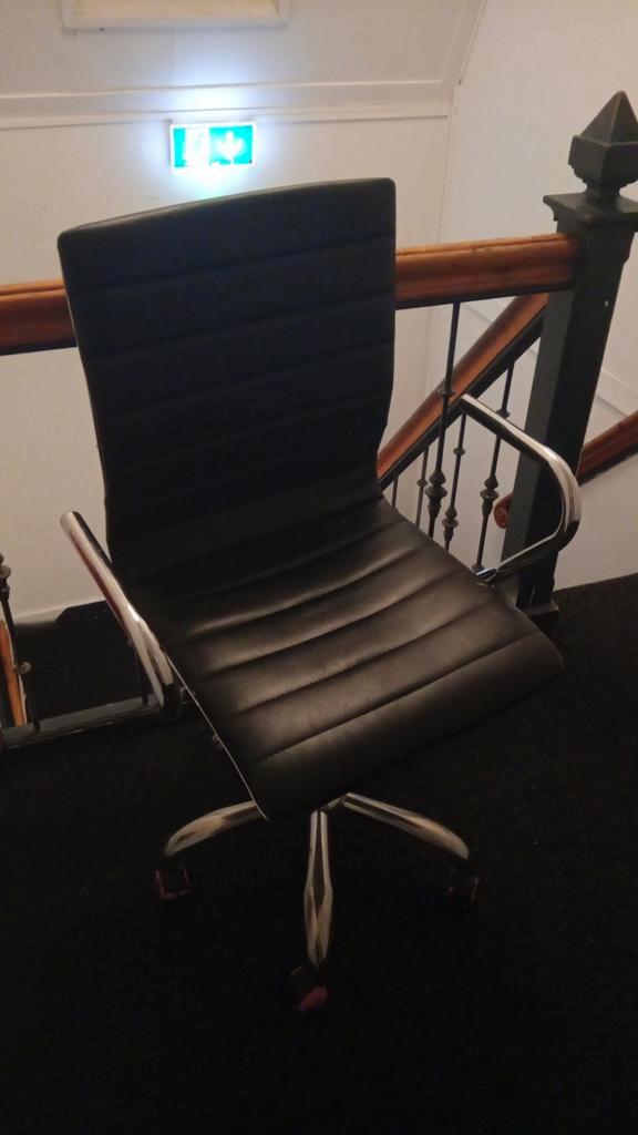 Comfortabele bureaustoel in goede staat. Ideaal voor thuiswerken of op kantoor. Zwarte bekleding met chromen onderstel. Verstelbare hoogte en kantelfunctie. Gebruikt, maar nog in prima conditie. Mag m
