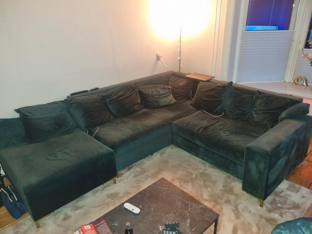 Gratis af te halen in meppel: groene hoekbank met kussens. De bank heeft een kattengeur en kan een reiniging gebruiken. Let op: 1 van de poten staat een beetje scheef.