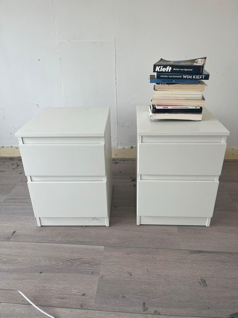 Set van twee witte nachtkastjes met elk twee laden. Ideaal voor naast het bed om spullen op te bergen. De kastjes zijn in goede staat en bieden voldoende ruimte voor een lamp, boek en andere persoonli