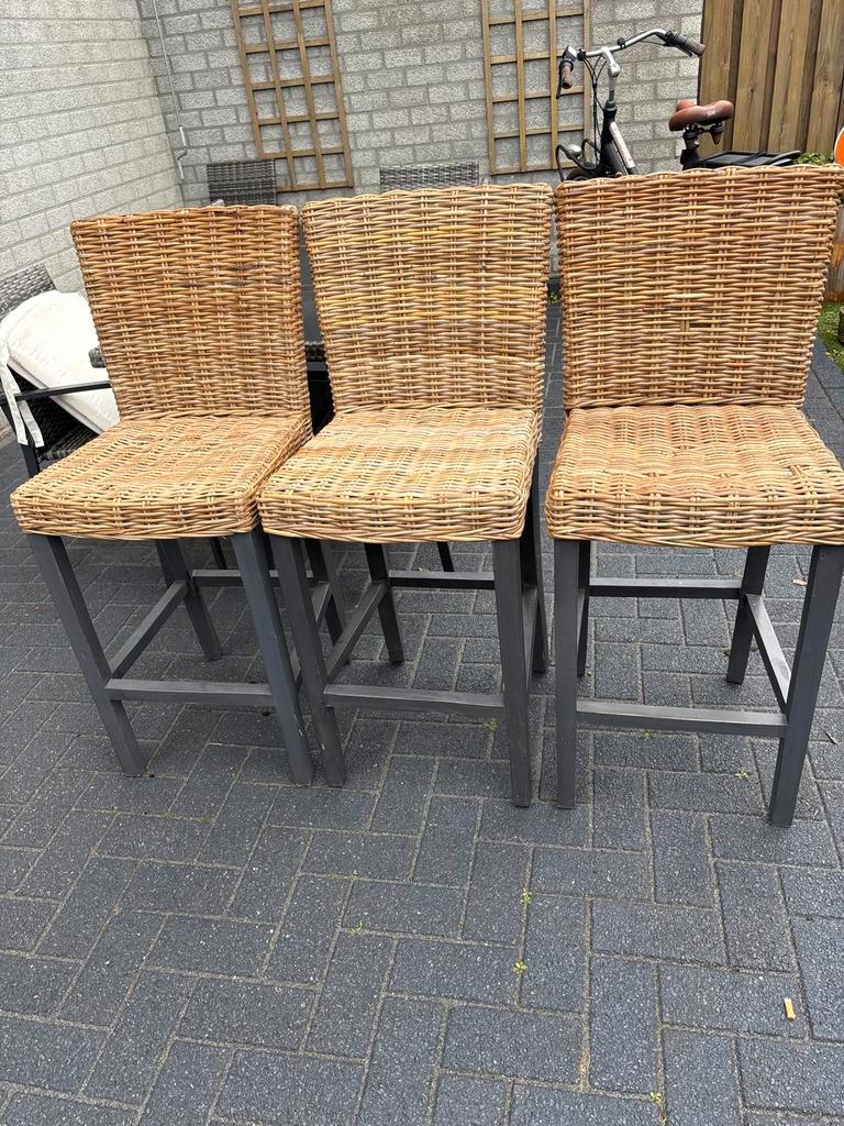Drie houten stoelen mogen gratis worden afgehaald. Ze zijn gebruikt, maar nog in goede staat. Ideaal voor in de tuin of op het balkon.