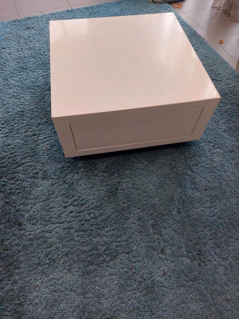 Kleur wit. Is op wieltjes 1 wieltje is kapot, 2 wieltjes zijn reeds vervangen via bouwmarkt. Afmeting 70x70.