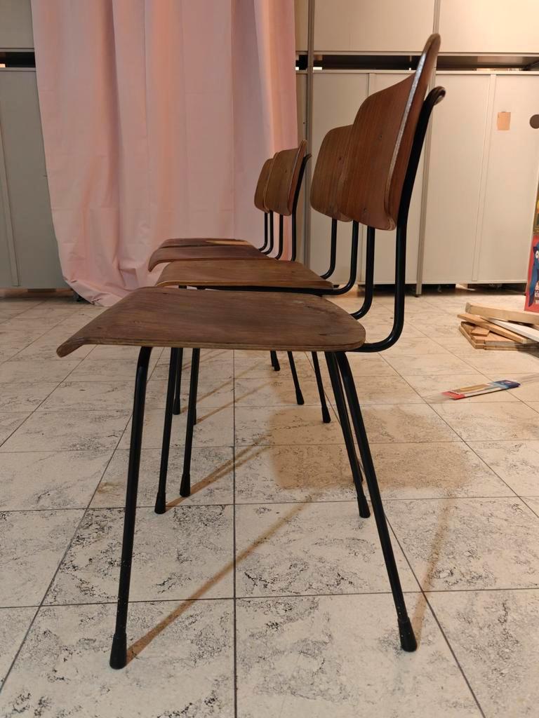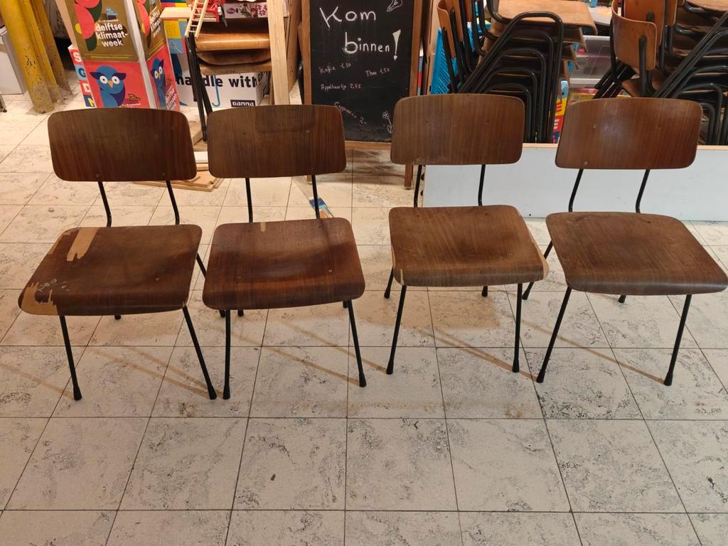 Vier retro houten stoelen met metalen frame. Beetje beschadigd maar met een likje verf weer mooi!