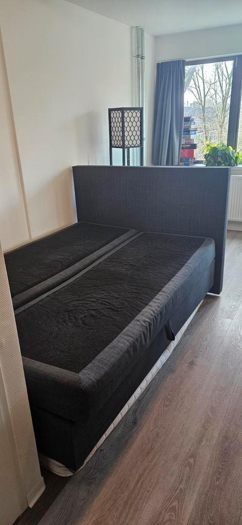 Gratis boxspring met opbergruimte. 140X200 cm. Donkergrijs. Gebruikte staat. Zonder topmatras, want daar is op geslapen (ligt op de foto onder het bed). Zelf demonteren en ophalen voor 15 maart.