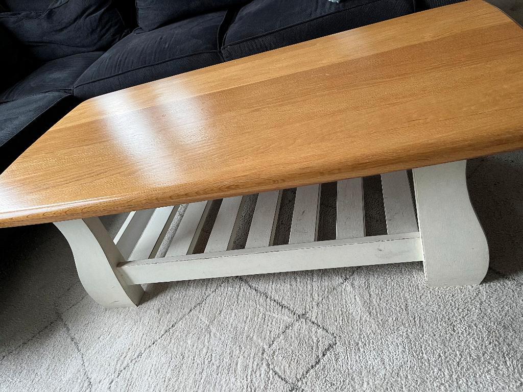 Stevige salontafel met houten blad en wit onderstel, inclusief handige plank onderin. Afmetingen (ongeveer): l: 135cm b: 67cm h: 47cm in nette staat met lichte gebruikssporen. Gratis af te halen. Stuu